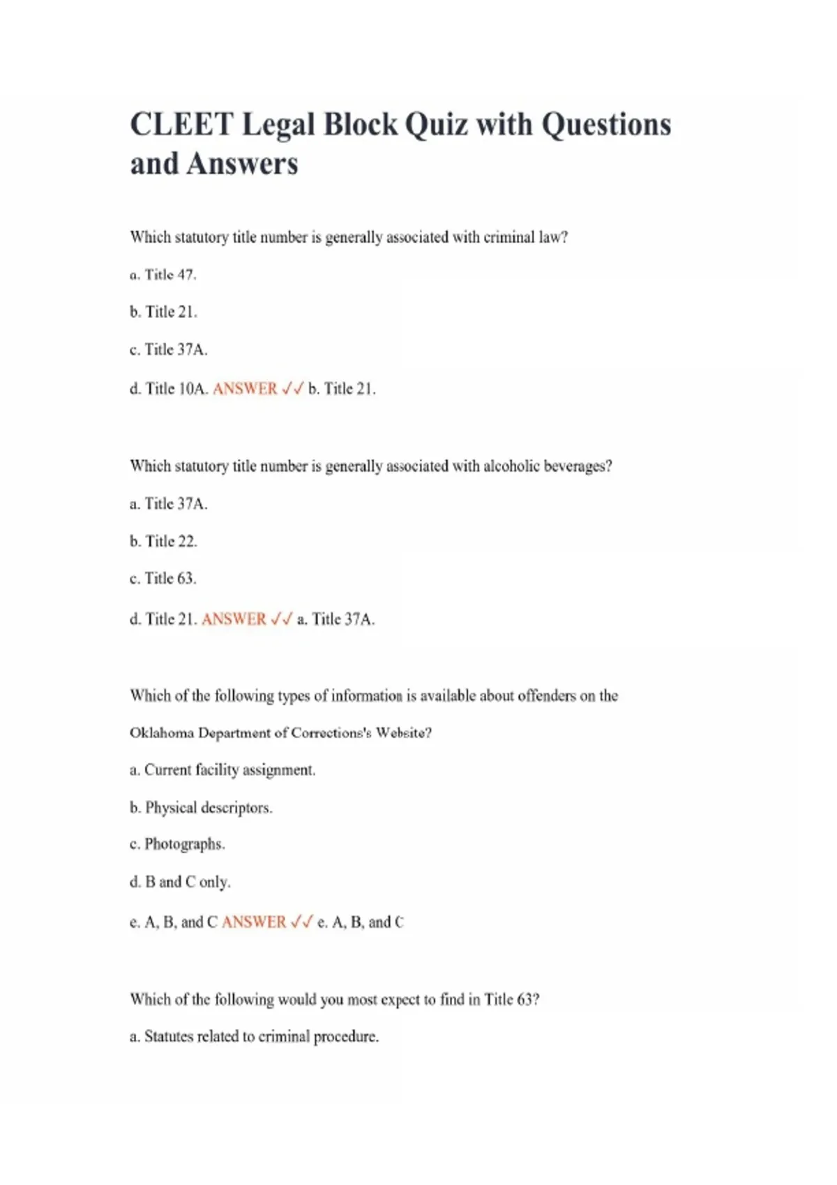 CLEET Legal Block Quiz with Questions and Answers Which statutory title number is generally associated with criminal law? a. Title 47. b. Title 21. c. Title 37A. d. Title 10A. ANSWER b. Title 21. Which statutory title number is generally associated with alcoholic beverages? a. Title 37A. b. Title 22. c. Title 63. d. Title 21. ANSWER a. Title 37A. Which of the following types of information is available about offenders on the Oklahoma Department of Corrections's Website? a. Current facility assignment. b. Physical descriptors. c. Photographs. d. B and C only. e. A, B, and C ANSWER e. A, B, and C Which of the following would you most expect to find in Title 63? a. Statutes related to criminal procedure.