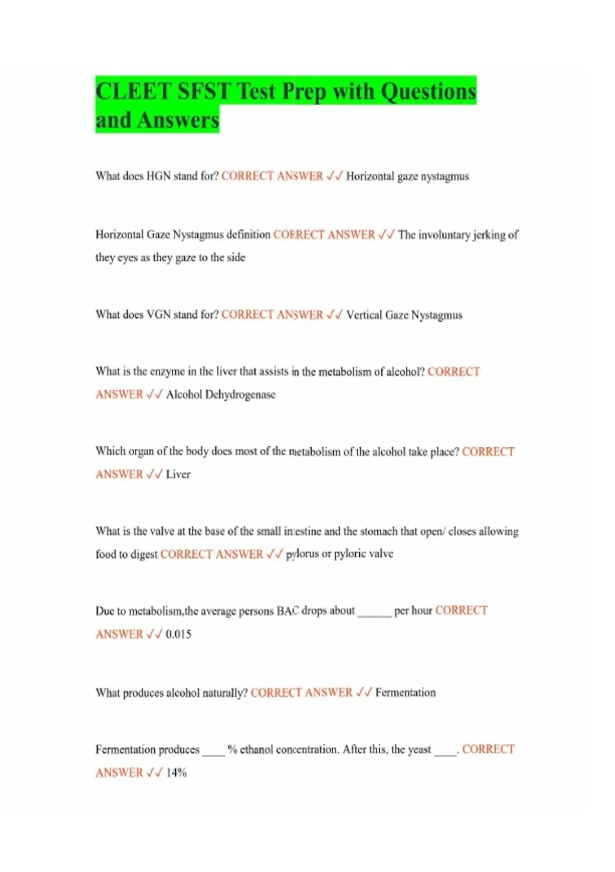 CLEET SFST Test Prep with Questions and Answers What does HGN stand for? CORRECT ANSWER Horizontal gaze nystagmus Horizontal Gaze Nystagmus definition CORRECT ANSWER The involuntary jerking of they eyes as they gaze to the side What does VGN stand for? CORRECT ANSWER Vertical Gaze Nystagmus What is the enzyme in the liver that assists in the metabolism of alcohol? CORRECT ANSWER Alcohol Dehydrogenase Which organ of the body does most of the metabolism of the alcohol take place? CORRECT ANSWER Liver What is the valve at the base of the small intestine and the stomach that open/ closes allowing food to digest CORRECT ANSWER pylorus or pyloric valve Due to metabolism,the average persons BAC drops about ______ per hour CORRECT ANSWER 0.015 What produces alcohol naturally? CORRECT ANSWER Fermentation Fermentation produces ____ % ethanol concentration. After this, the yeast ____. CORRECT ANSWER 14%