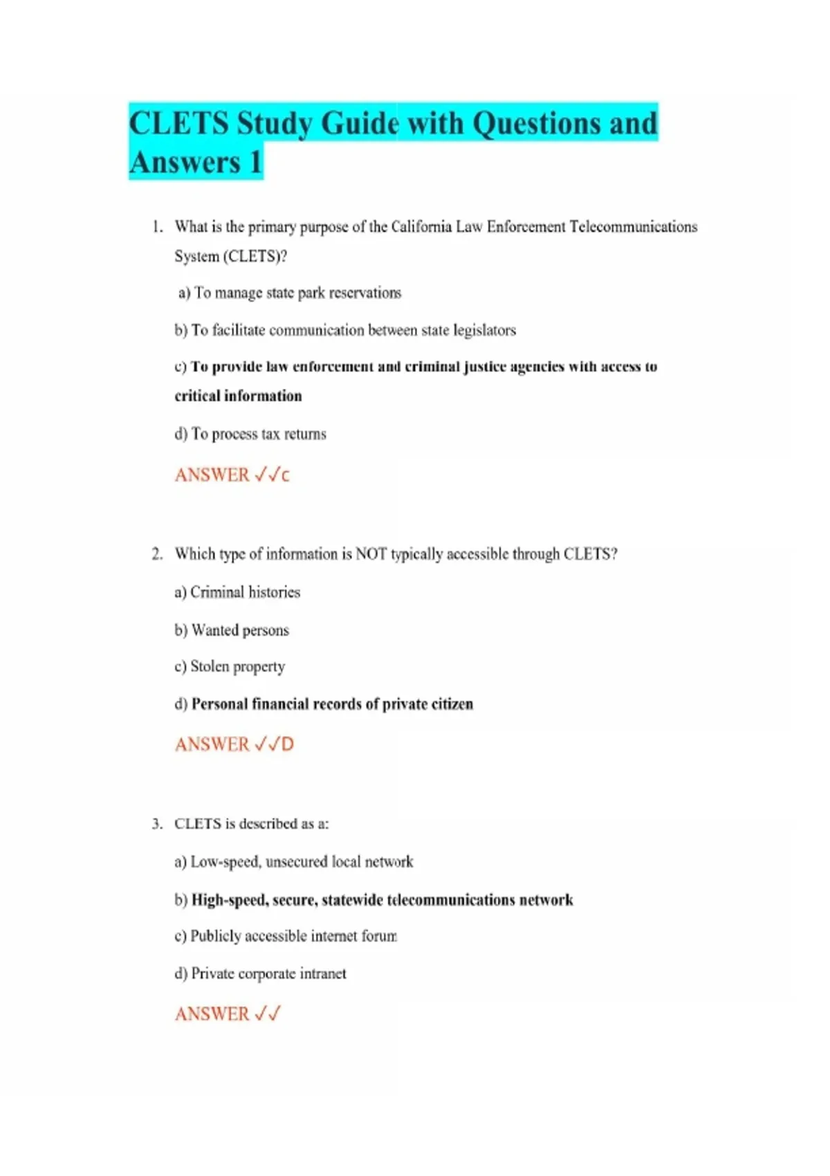 CLETS Study Guide with Questions and Answers