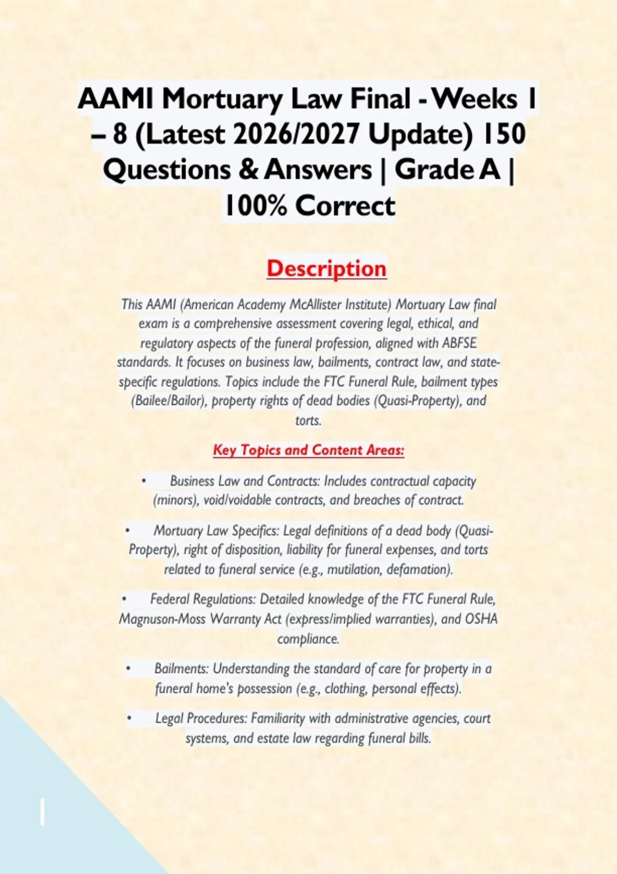 AAMI Mortuary Law Final - Weeks 1 – 8 (Latest 2026/2027 Update) 150 Questions & Answers | Grade A | 100% Correct Description This AAMI (American Academy McAllister Institute) Mortuary Law final exam is a comprehensive assessment covering legal, ethical, and regulatory aspects of the funeral profession, aligned with ABFSE standards. It focuses on business law, bailments, contract law, and state-specific regulations. Topics include the FTC Funeral Rule, bailment types (Bailee/Bailor), property rights of dead bodies (Quasi-Property), and torts. Key Topics and Content Areas: • Business Law and Contracts: Includes contractual capacity (minors), void/voidable contracts, and breaches of contract. • Mortuary Law Specifics: Legal definitions of a dead body (Quasi-Property), right of disposition, liability for funeral expenses, and torts related to funeral service (e.g., mutilation, defamation). • Federal Regulations: Detailed knowledge of the FTC Funeral Rule, Magnuson-Moss Warranty Act (express/implied warranties), and OSHA compliance. • Bailments: Understanding the standard of care for property in a funeral home's possession (e.g., clothing, personal effects). • Legal Procedures: Familiarity with administrative agencies, court systems, and estate law regarding funeral bills.