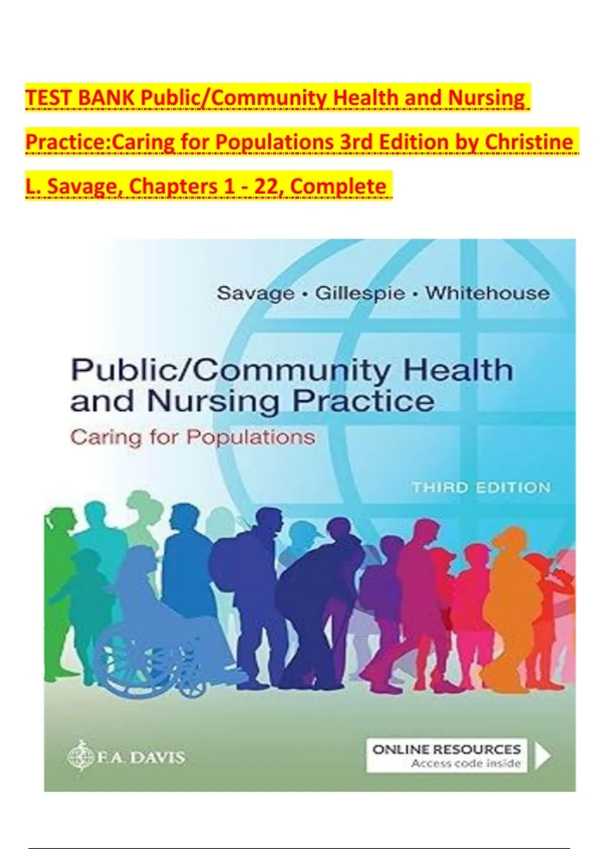 Prepare effectively for public and community health nursing exams with this comprehensive Test Bank for Public/Community Health and Nursing Practice: Caring for Populations, Third Edition by Christine L. Savage, Gordon L. Gillespie & Erin Whitehouse — fully updated for 2026. This Test Bank is ideal for nursing students, public health learners, and community health professionals who want targeted practice questions that reinforce population health concepts, health promotion, disease prevention, and community-based nursing interventions. What’s included: ️ Extensive practice questions mapped to textbook chapters ️ Accurate answer keys for efficient self-assessment ️ Coverage of public health principles, community assessments, epidemiology, health policy, and population-focused nursing care ️ Mix of recall, application, and critical-thinking questions ️ Perfect for quizzes, midterms, finals, and group study Why this helps you succeed: 100% Exam Prep Guarantee — designed to boost exam confidence Updated for 2026 curriculum relevance Reinforces population health nursing knowledge and clinical reasoning Study smarter, strengthen your community health skills, and walk into every assessment fully prepared.