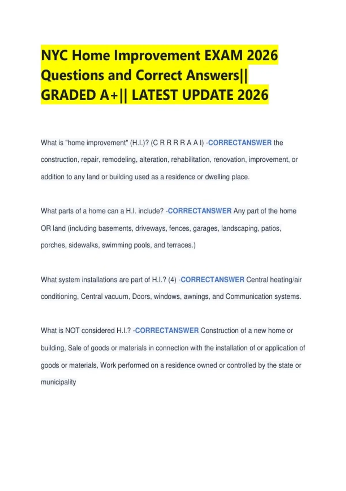 NYC Home Improvement EXAM 2026 Questions and Correct Answers|| GRADED A+|| LATEST UPDATE 2026