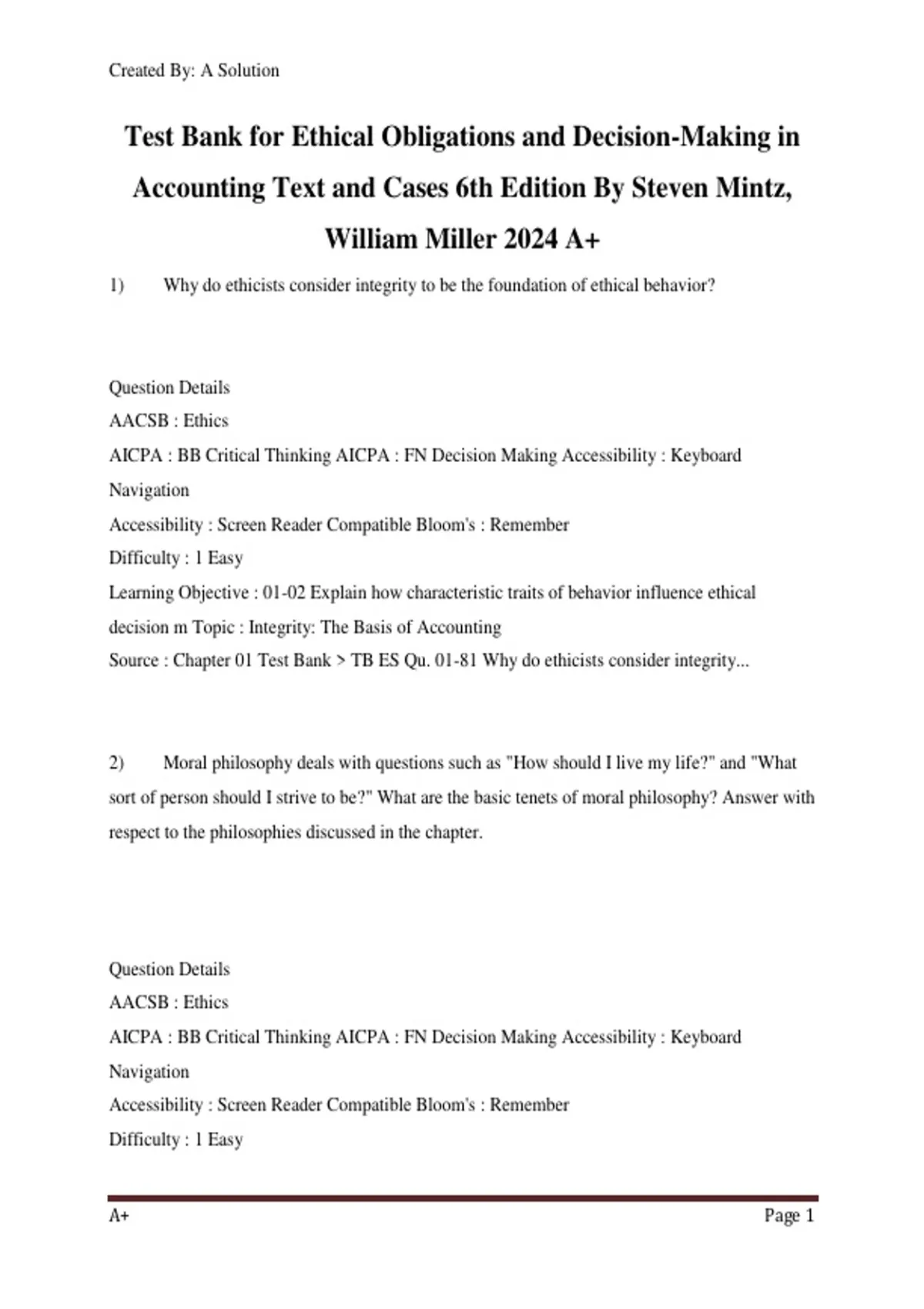 Source : Chapter 01 Test Bank > TB ES Qu. 01-81 Why do ethicists consider integrity...