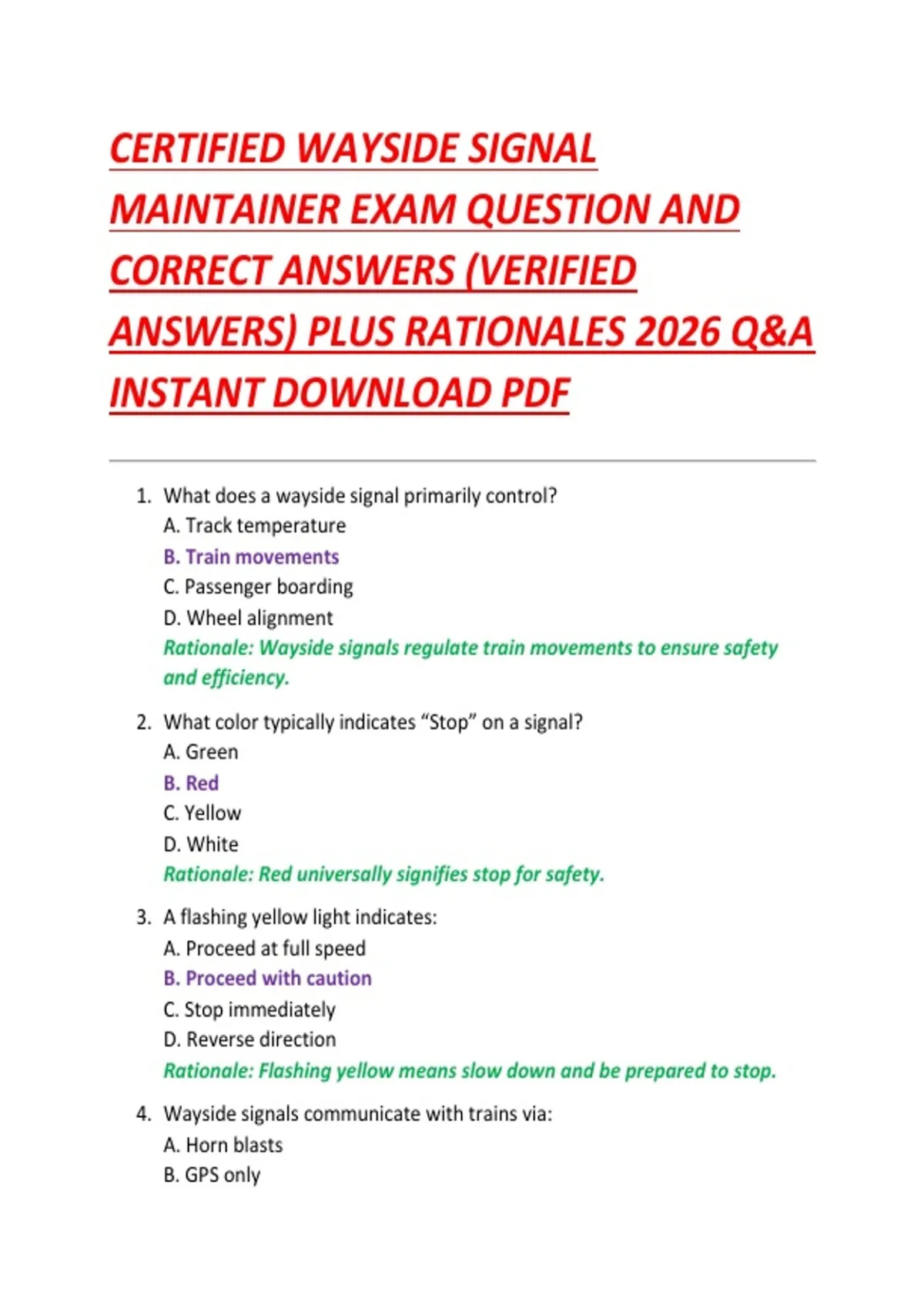CERTIFIED WAYSIDE SIGNAL MAINTAINER EXAM QUESTION AND CORRECT ANSWERS (VERIFIED ANSWERS) PLUS RATIONALES 2026 Q&A INSTANT DOWNLOAD PDF