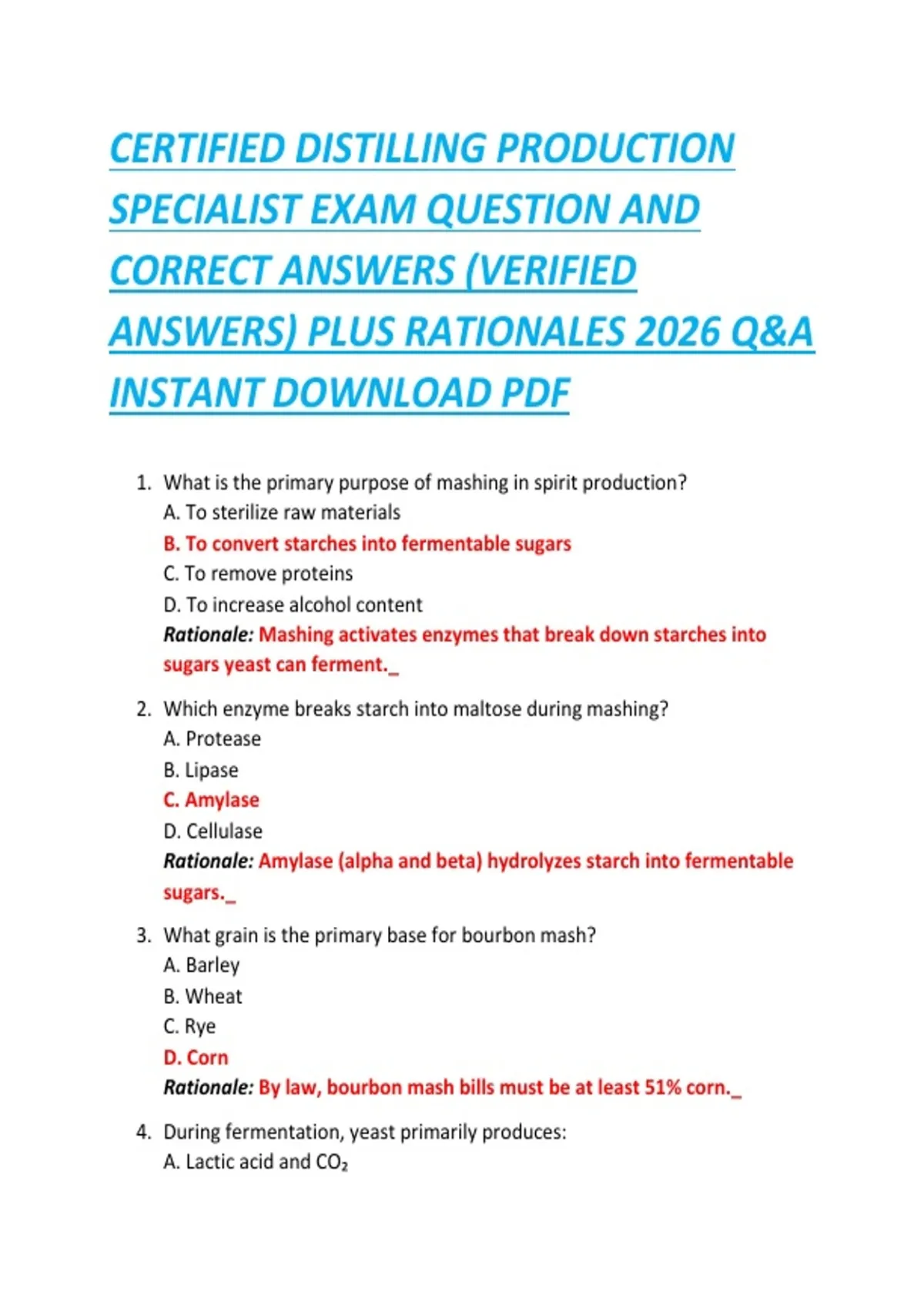 CERTIFIED DISTILLING PRODUCTION SPECIALIST EXAM QUESTION AND CORRECT ANSWERS (VERIFIED ANSWERS) PLUS RATIONALES 2026 Q&A INSTANT DOWNLOAD PDF