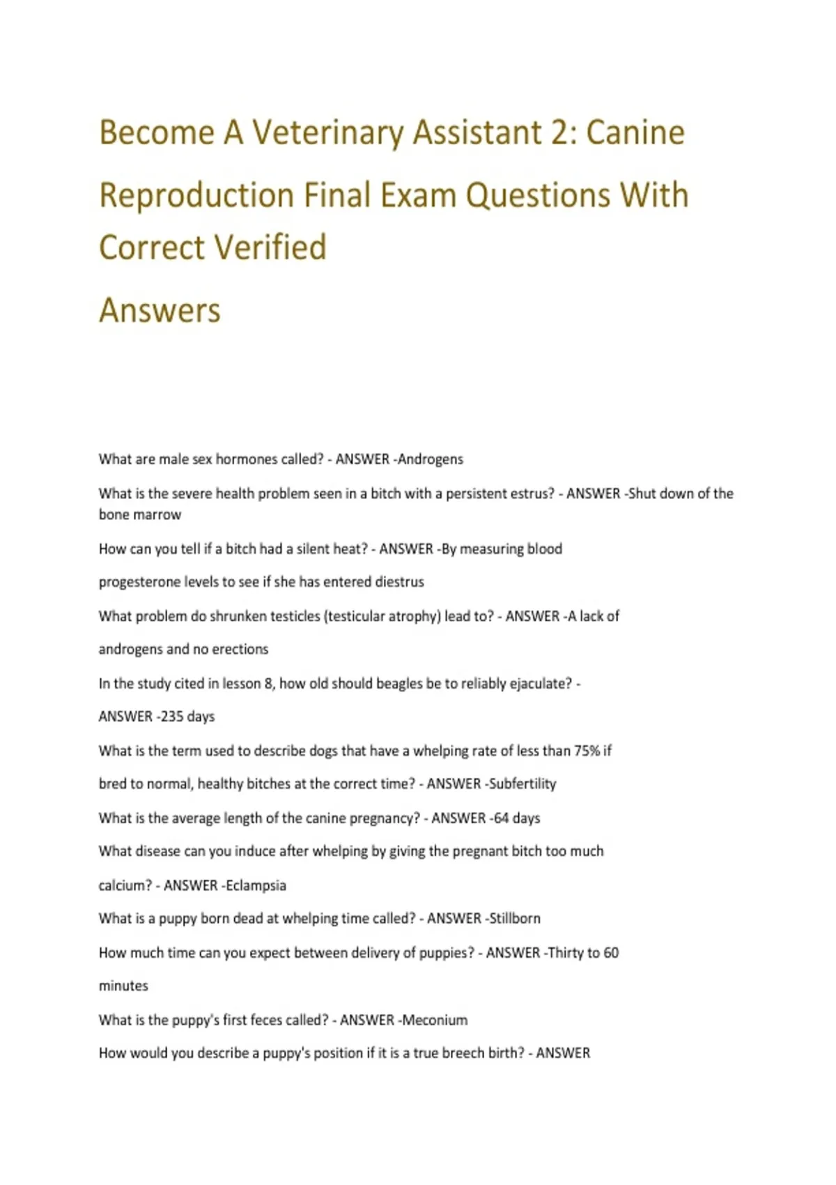 Become A Veterinary Assistant 2: Canine Reproduction Final Exam Questions With Correct Verified Answers What are male sex hormones called? - ANSWER -Androgens What is the severe health problem seen in a bitch with a persistent estrus? - ANSWER -Shut down of the bone marrow How can you tell if a bitch had a silent heat? - ANSWER -By measuring blood progesterone levels to see if she has entered diestrus What problem do shrunken testicles (testicular atrophy) lead to? - ANSWER -A lack of androgens and no erections In the study cited in lesson 8, how old should beagles be to reliably ejaculate? - ANSWER -235 days What is the term used to describe dogs that have a whelping rate of less than 75% if bred to normal, healthy bitches at the correct time? - ANSWER -Subfertility What is the average length of the canine pregnancy? - ANSWER -64 days What disease can you induce after whelping by giving the pregnant bitch too much calcium? - ANSWER -Eclampsia What is a puppy born dead at whelping time called? - ANSWER -Stillborn How much time can you expect between delivery of puppies? - ANSWER -Thirty to 60 minutes What is the puppy's first feces called? - ANSWER -Meconium How would you describe a puppy's position if it is a true breech birth? - ANSWER Posterior presentation with hindlegs facing forward What temperature signals a problem could be emerging in a recently-whelped bitch? - ANSWER -103.8 degrees F (39.9 degrees C) What does reddish-brown milk indicate? - ANSWER -The presence of blood in the milk. What can predispose a bitch to hypocalcemia? - ANSWER -Adding a calcium supplement to the diet during pregnancy Why are chilled puppies more susceptible to infections? - ANSWER -Their infection fighting white blood cells are not functioning optimally. What is a home remedy for hypoglycemia? - ANSWER -Rubbing sugar solution directly to the gums. What is a hermaphrodite? - ANSWER -It is a puppy that has both male and female body parts What are the symptoms of a Canine Herpesvirus infection? - ANSWER -Abortion and death of newborns What is the role of the gubernaculum? - ANSWER -It pulls the testicle from its birth site to the scrotum What is the name of the structure that swells on each side of the penis during an erection? - ANSWER -Bulbus glandis What disease plagues 50% of intact male dogs by the time they are 5 years old? - ANSWER -Benign Prostatic Hyperplasia When does the progesterone level in the blood suddenly rise? - ANSWER -Just before ovulation What stage of estrous is characterized by hormonal dormancy? - ANSWER -Anestrus What method of assessing the stage in the reproductive cycle uses a cotton swab? - ANSWER -Vaginal smear What is the name of the first portion of semen ejaculated? - ANSWER -Pre-sperm fluid What temperature is suitable for storing chilled semen? - ANSWER -Four degrees Celsius Why are the hindquarters of the bitch elevated after mating? - ANSWER -It boosts conception rates because it allows semen to move towards the cervix What structure turns into a corpus luteum? - ANSWER -A follicle What is the effect of advanced age on fertility of the bitch? - ANSWER -It increases the probability of the bitch not conceiving If a bitch loses her puppies early in pregnancy and a uterine infection is suspected, what test would be applicable? - ANSWER -Check for Brucella and Canine Herpes Virus When a puppy is eight weeks old, how often should he be fed? - ANSWER -Three or four times a day According to the Orthopedic Foundation for Animals, what percentage of Bulldogs suffer from hip dysplasia? - ANSWER -75% If repeated breedings of two keeshonds always result in a quarter of their puppies (both males and females) with diabetes, what does this suggest about how the disease is inherited? - ANSWER -Diabetes is a recessive trait Why do most breeders use OFA rather than PennHIP to screen for hip dysplasia? - ANSWER -The veterinarian can do the OFA certification him or herself and they don't have to be sent to a radiologist Where are the ovaries located? - ANSWER -Behind the kidneys