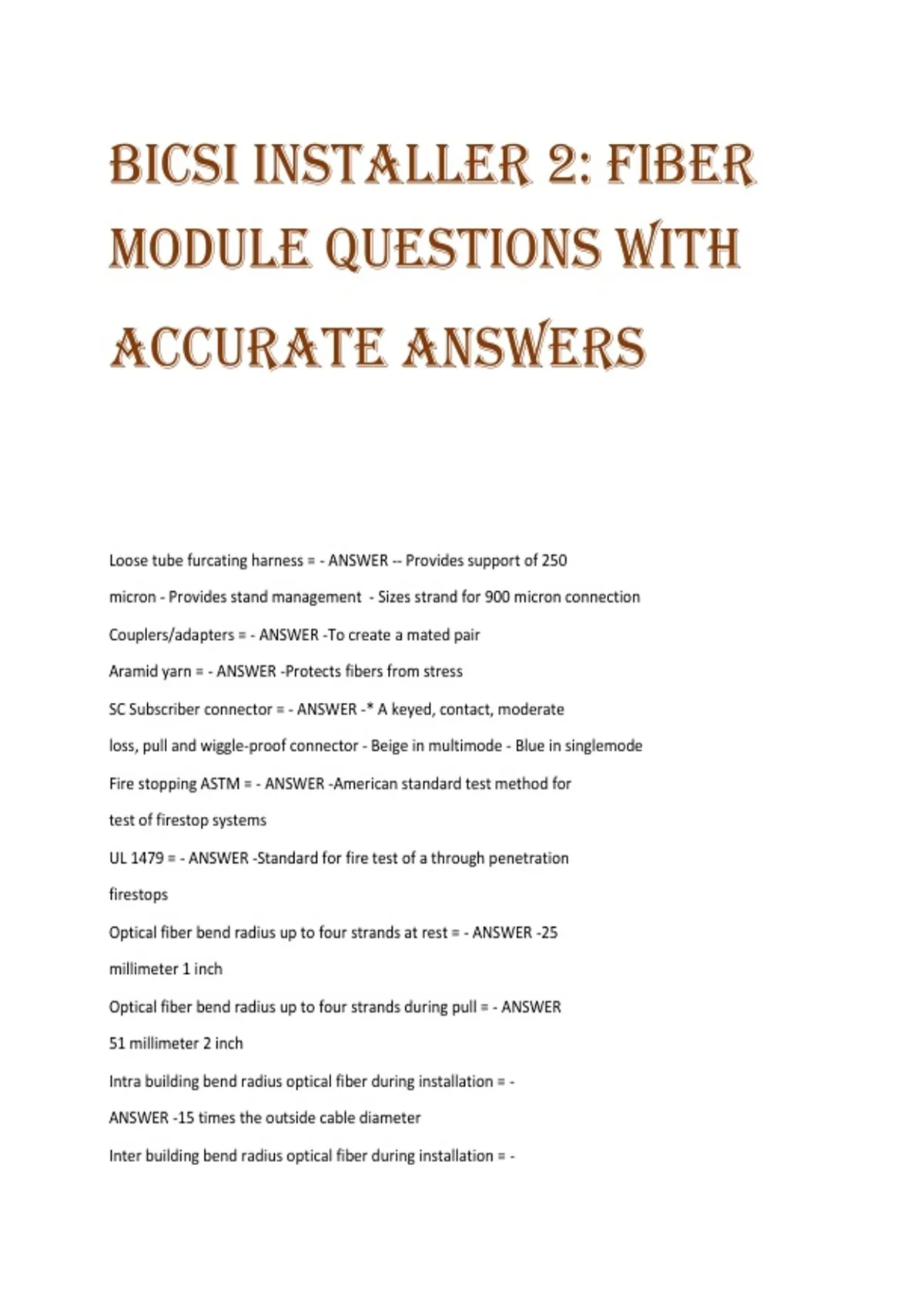 BICSI INSTALLER 2: FIBER MODULE QUESTIONS WITH ACCURATE ANSWERS Loose tube furcating harness = - ANSWER -- Provides support of 250 micron - Provides stand management - Sizes strand for 900 micron connection Couplers/adapters = - ANSWER -To create a mated pair Aramid yarn = - ANSWER -Protects fibers from stress SC Subscriber connector = - ANSWER -* A keyed, contact, moderate loss, pull and wiggle-proof connector - Beige in multimode - Blue in singlemode Fire stopping ASTM = - ANSWER -American standard test method for test of firestop systems UL 1479 = - ANSWER -Standard for fire test of a through penetration firestops Optical fiber bend radius up to four strands at rest = - ANSWER -25 millimeter 1 inch Optical fiber bend radius up to four strands during pull = - ANSWER 51 millimeter 2 inch Intra building bend radius optical fiber during installation = - ANSWER -15 times the outside cable diameter Inter building bend radius optical fiber during installation = - ANSWER -20 times the outside cable diameter Backbone fiber bend radius at rest = - ANSWER -10 times LC Connecter = - ANSWER -Latching connector End face geometry, three types are = - ANSWER -- Physical contact [PC] - Ultra physical contact [UPC] - Angled polish contact [APC] Field terminations have three types = - ANSWER -- Scribe and cleave - Cleave and secure - Slice on Methods to terminate optical fiber = - ANSWER -- Heat cured epoxy termination - Heat activated adhesive - Ultraviolet [UV] light cured termination - Crimp termination - Cleave and secure - Anaerobic termination Ways to test fiber = - ANSWER -5 ways OFSTP -14/OFSTP -7 are = - ANSWER -Double ended tests for testing installed cable plants Fiber test method 1 = - ANSWER -Cable reference Cable reference = - ANSWER -Does not work with all cable plants When connectors do not match = - ANSWER -Use 2 cable reference Insertion loss - ANSWER -The signal loss resulting from the insertion of component , or link or channel [splice], between a transmitter and receiver [often referred to as a attenuation] = Wavelength = - ANSWER -- Distance between two corresponding points on a wave - Measured in nanometers nm Core = - ANSWER -The center of the optical fiber through which light is transmitted Bracing of wall mounted rack = - ANSWER -Must be supported to the: - Wall - Cable tray - Ladder rack Bandwidth = - ANSWER -A measure of the amount of information on optical fiber is capable of transporting - Described in terms of megahertz - kilometer - Increase length or the wavelength of the light source decreases the bandwidth Modal dispersion = - ANSWER -The temporal speeding of a pulse in a optical waveguide Chromatic dispersion = - ANSWER -Spreading of pulse in a optical cable Buffer = - ANSWER -A protective coating applied directly on the fiber Two primary methods by which the end core is illuminated - ANSWER -- Coaxial, identifying scratches and fine details - Oblique, clean view of core condition and cleanliness Index of refraction = - ANSWER -Increases the speed of light in that medium decreases Two types of optical fiber scopes = - ANSWER -- Direct-view microscope - Video microscope Two types of connection processes for optical fiber connections are = - ANSWER -- Scribe and polish - Cleave and secure Maximum splice loss mechanical of fusion splice = - ANSWER -- Shall not exceed 3dB regardless of the method [ Mechanical or fusion ] - Fusion will be no less than 1dB Frequency - ANSWER -Optical pulses using cycles per second, 1 unit of hertz = 1 cycle per second 4hz = 4 cycles per second Definition of transmission - ANSWER -The movement of information in the form of electrical or optical signals from one point to another through a transport medium Refraction - ANSWER -Bending of the light as it passes from one medium into another MHz - ANSWER -- Quantifies the bandwidth of a cabling system in a frequency range - Information handling capabilities of the medium Megabits - ANSWER -- transmission rate - Number of bits information that can be transported over the medium(vehicles of the highway) Anatomy of a fiber - ANSWER -- Core - Cladding - Coating