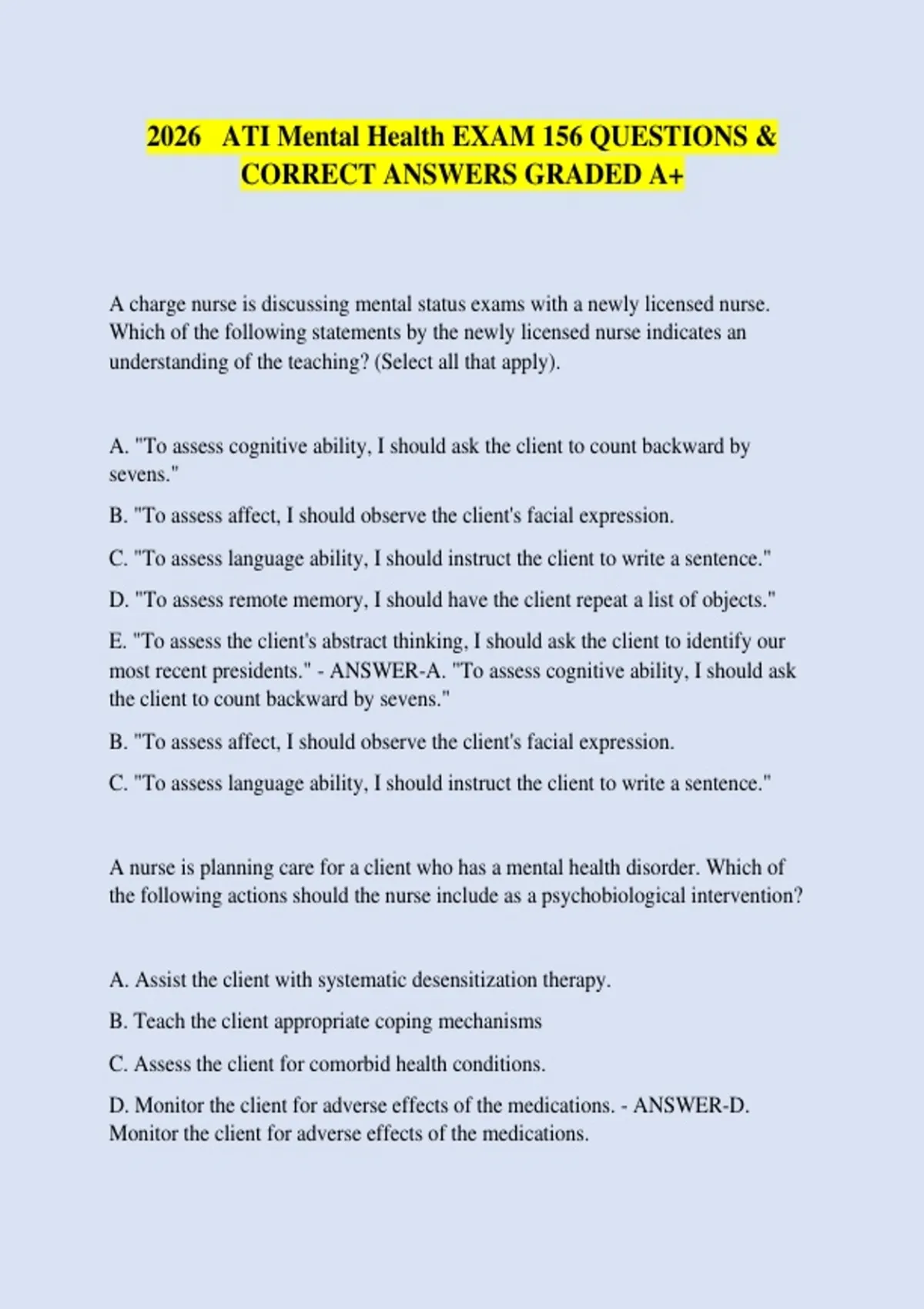 2026 ATI Mental Health EXAM 156 QUESTIONS & CORRECT ANSWERS GRADED A+