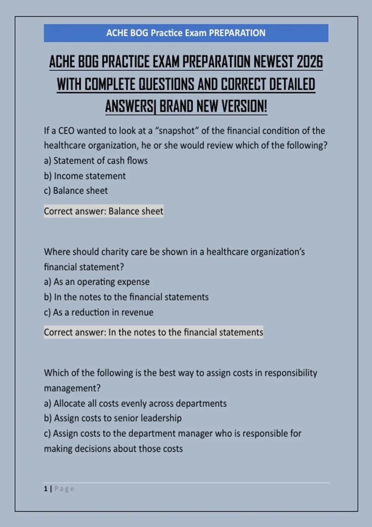 ACHE BOG PRACTICE EXAM PREPARATION NEWEST 2026 WITH COMPLETE QUESTIONS AND CORRECT DETAILED ANSWERS| BRAND NEW VERSION!