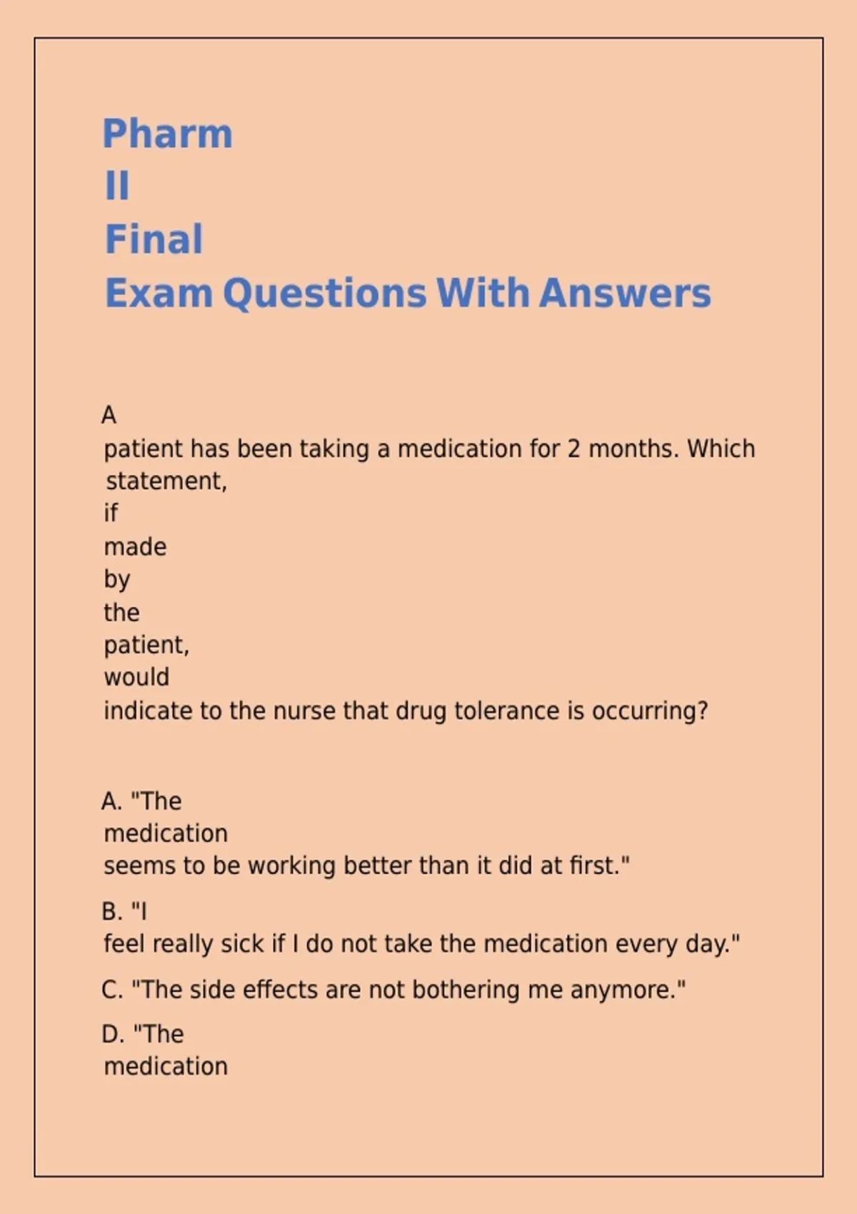 patient has been taking a medication for 2 months. Which