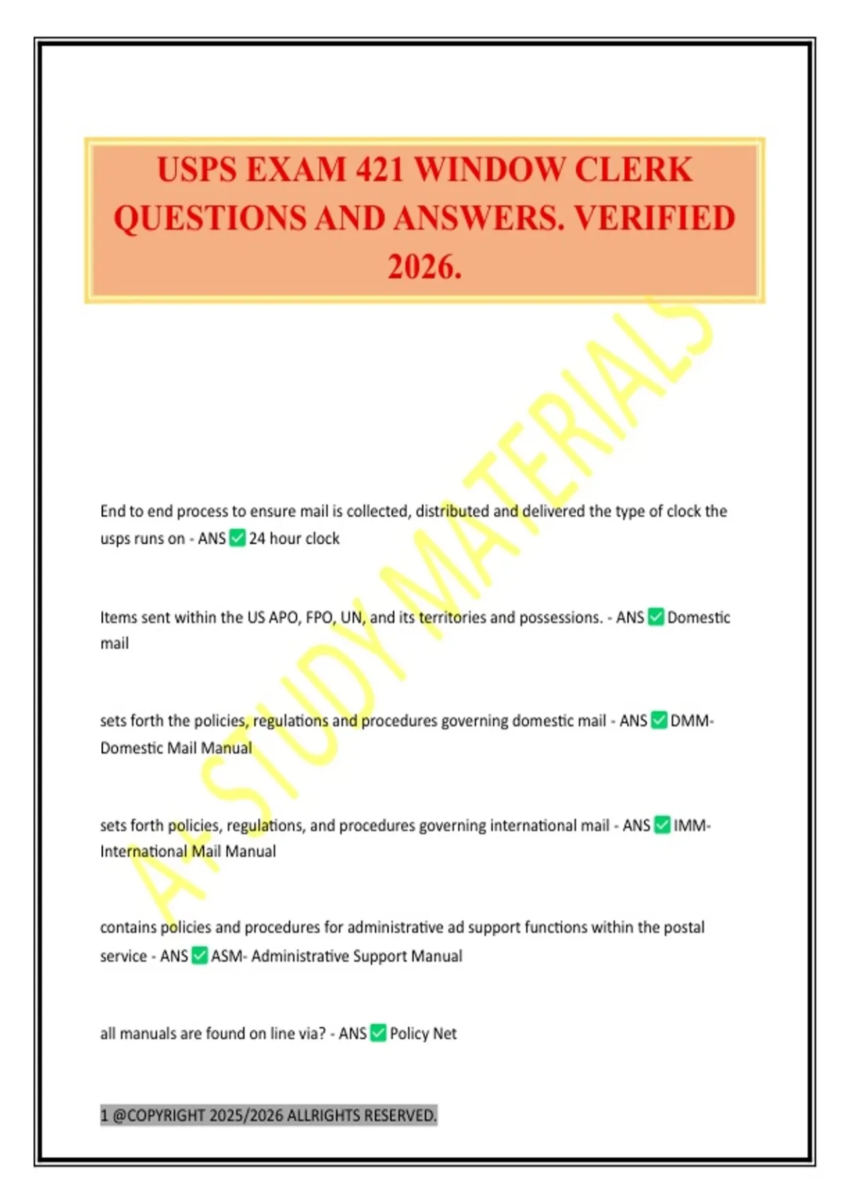 USPS EXAM 421 WINDOW CLERK QUESTIONS AND ANSWERS. VERIFIED 2026.