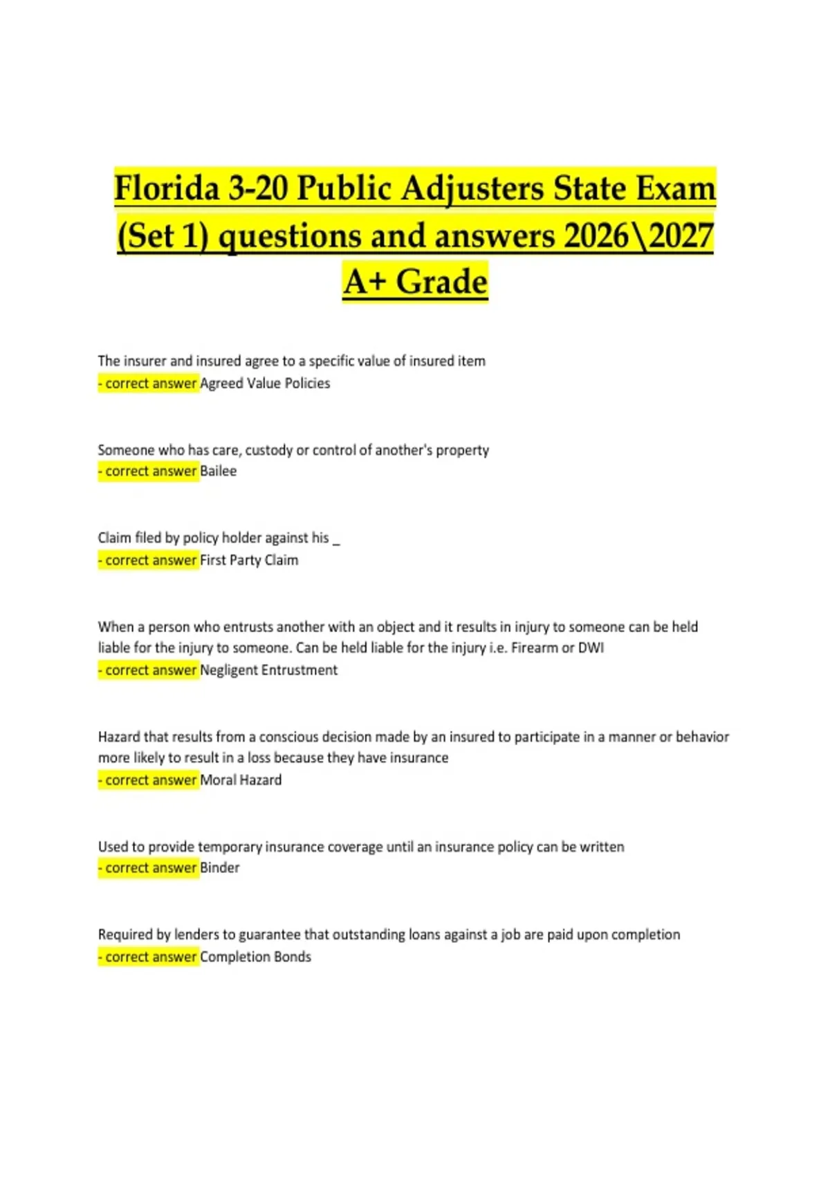 - correct answer Agreed Value Policies