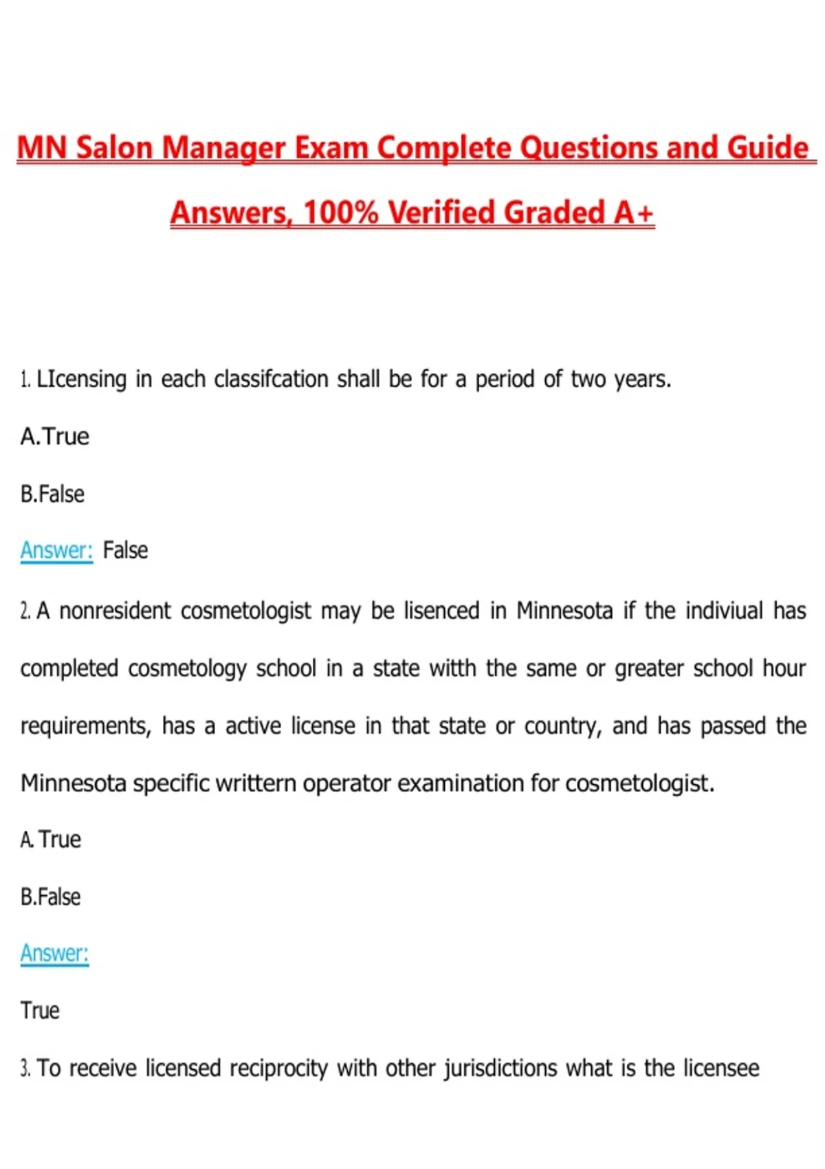 MN Salon Manager Test Questions with Correct Answers Pass the Exam, 100% Verified (2026 / 2027) Graded A+ Pass the Minnesota Salon Manager Test with confidence using this 2026 updated practice exam and study guide PDF. Built to reflect Minnesota Board of Cosmetology testing standards, this resource helps you master salon management, state laws & rules, sanitation, infection control, employee supervision, licensing requirements, safety, and business operations. Perfect for salon managers, salon owners, licensed cosmetologists, and Minnesota state board candidates, this guide includes realistic exam-style questions, verified correct answers, and clear explanations to improve accuracy and boost pass rates. Full-length MN Salon Manager practice exam Realistic multiple-choice & scenario-based questions Verified correct answers with easy explanations Coverage of Minnesota salon laws & regulations Key topics: salon operations, sanitation, licensing, ethics, payroll, and safety Updated for 2026 Minnesota State Board standards Printable & mobile-friendly PDF format Instant digital download — study immediately MN salon manager test, Minnesota salon manager exam, MN cosmetology laws test, salon management practice test, Minnesota state board cosmetology exam, cosmetology manager test prep, salon business exam, cosmetology sanitation exam, MN salon rules exam, salon manager study guide PDF, cosmetology regulations Minnesota, MN salon license exam, salon manager mock exam 2026, cosmetology exam questions, instant PDF download
