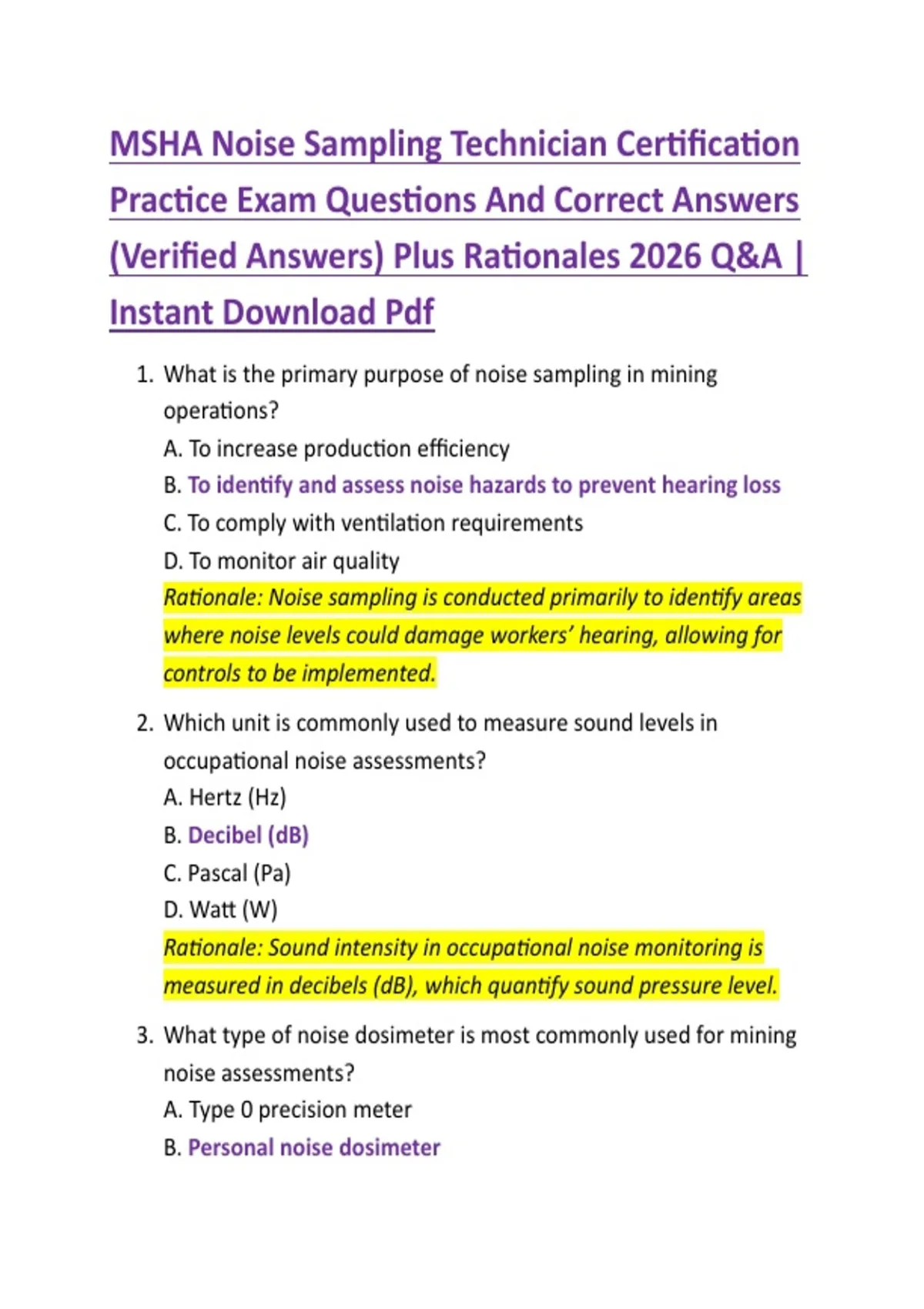 MSHA Noise Sampling Technician Certification Practice Exam Questions And Correct Answers (Verified Answers) Plus Rationales 2026 Q&A | Instant Download Pdf