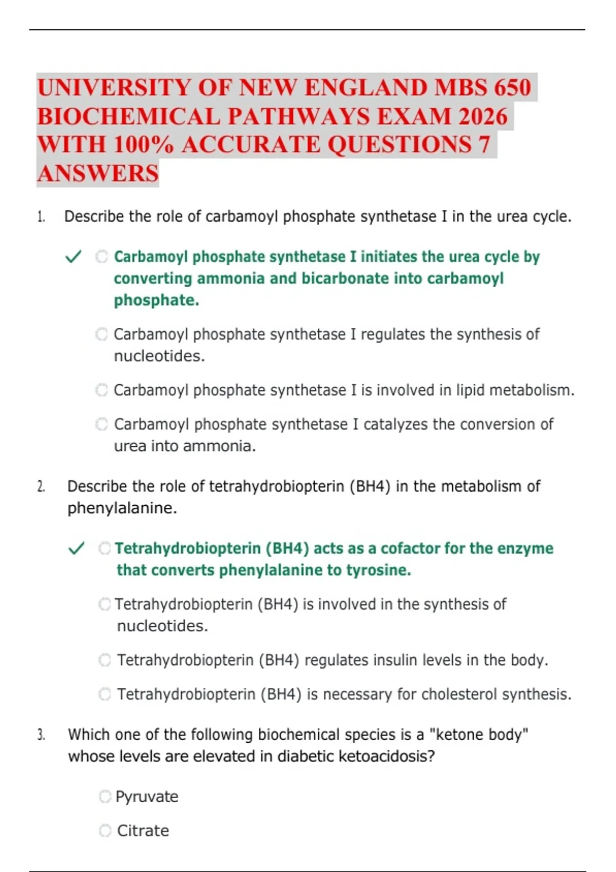UNIVERSITY OF NEW ENGLAND MBS 650 BIOCHEMICAL PATHWAYS EXAM 2026 WITH 100% ACCURATE QUESTIONS 7 ANSWERS