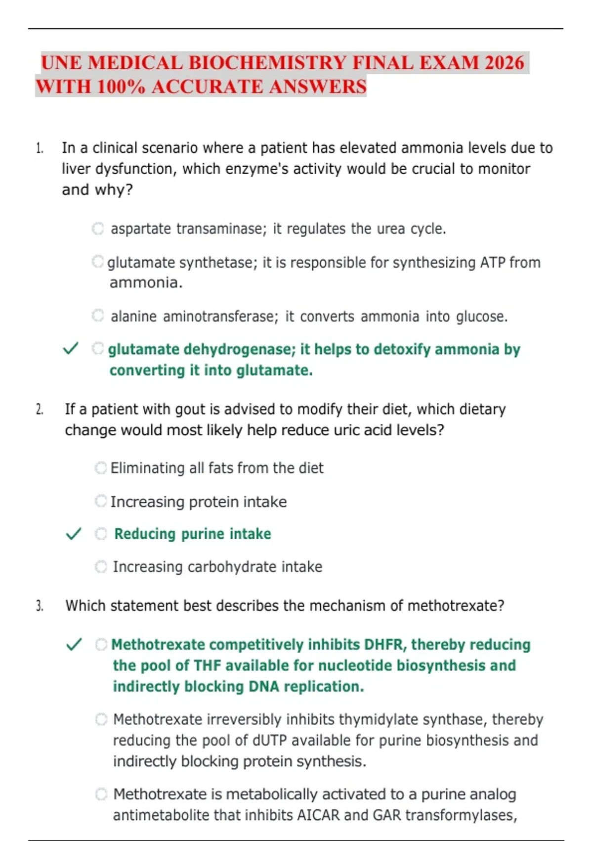 UNE MEDICAL BIOCHEMISTRY FINAL EXAM 2026 WITH 100% ACCURATE ANSWERS