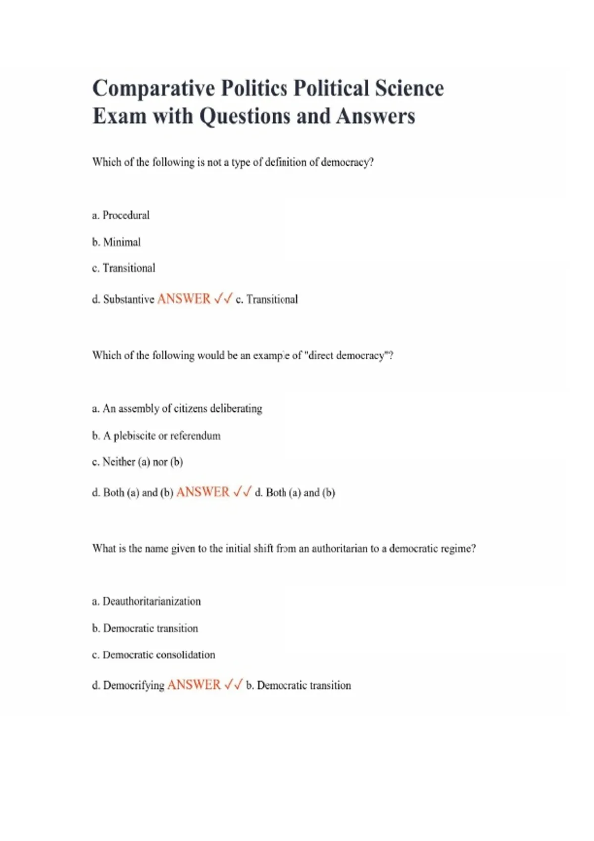Comparative Politics Political Science Exam with Questions and Answers Which of the following is not a type of definition of democracy? a. Procedural b. Minimal c. Transitional d. Substantive ANSWER c. Transitional Which of the following would be an example of "direct democracy"? a. An assembly of citizens deliberating b. A plebiscite or referendum c. Neither (a) nor (b) d. Both (a) and (b) ANSWER d. Both (a) and (b) What is the name given to the initial shift from an authoritarian to a democratic regime? a. Deauthoritarianization b. Democratic transition c. Democratic consolidation d. Democrifying ANSWER b. Democratic transition What is the name given to the increasing strength and stability of a democratic regime after a democratic transition? a. Deauthoritarianization b. Democratic transition c. Democratic consolidation d. Democrifying ANSWER c. Democratic consolidation