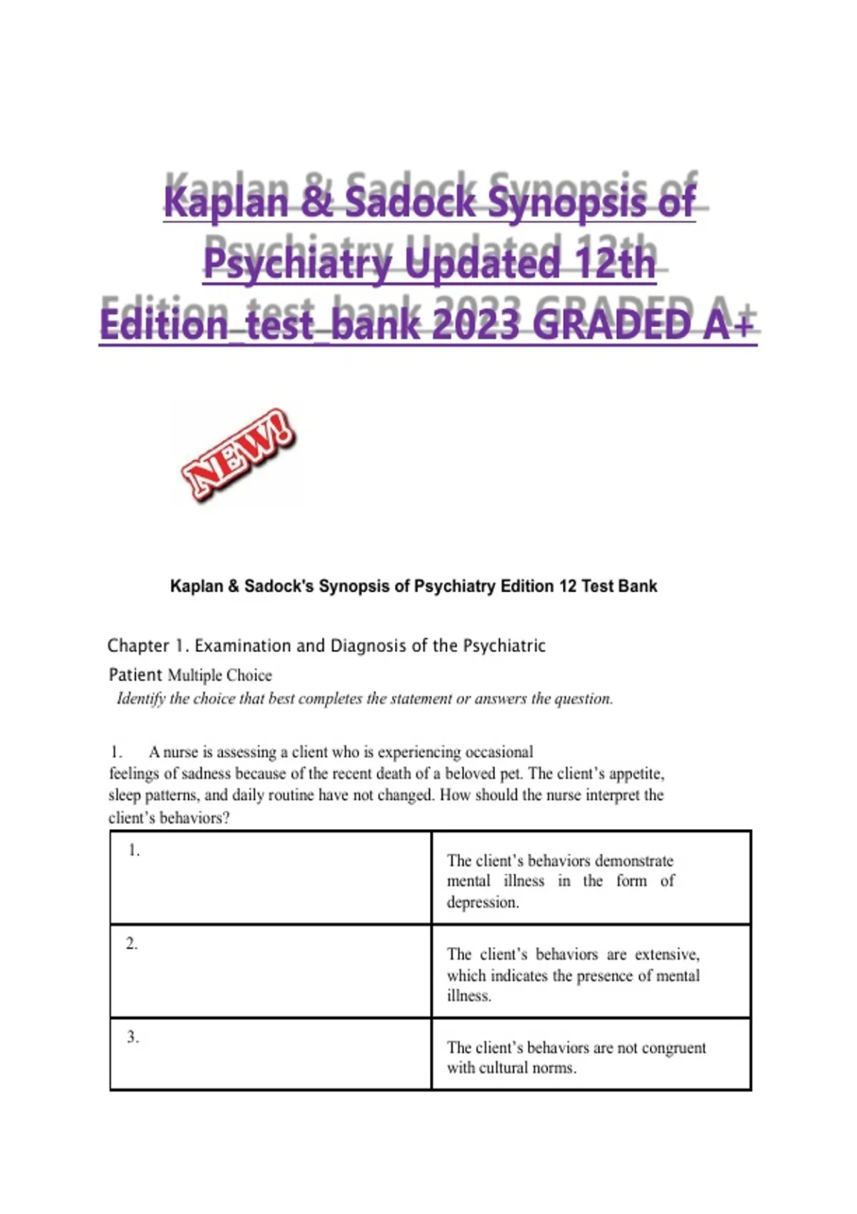Get the Test Bank for Kaplan and Sadock’s Synopsis of Psychiatry, 12th Edition, fully 2026 updated and covering all chapters with accurate answers. This psychiatry test bank includes comprehensive exam-focused questions designed to support medical students, nursing students, residents, and instructors in mastering clinical psychiatry concepts, DSM-based disorders, diagnosis, and treatment for exams and coursework.