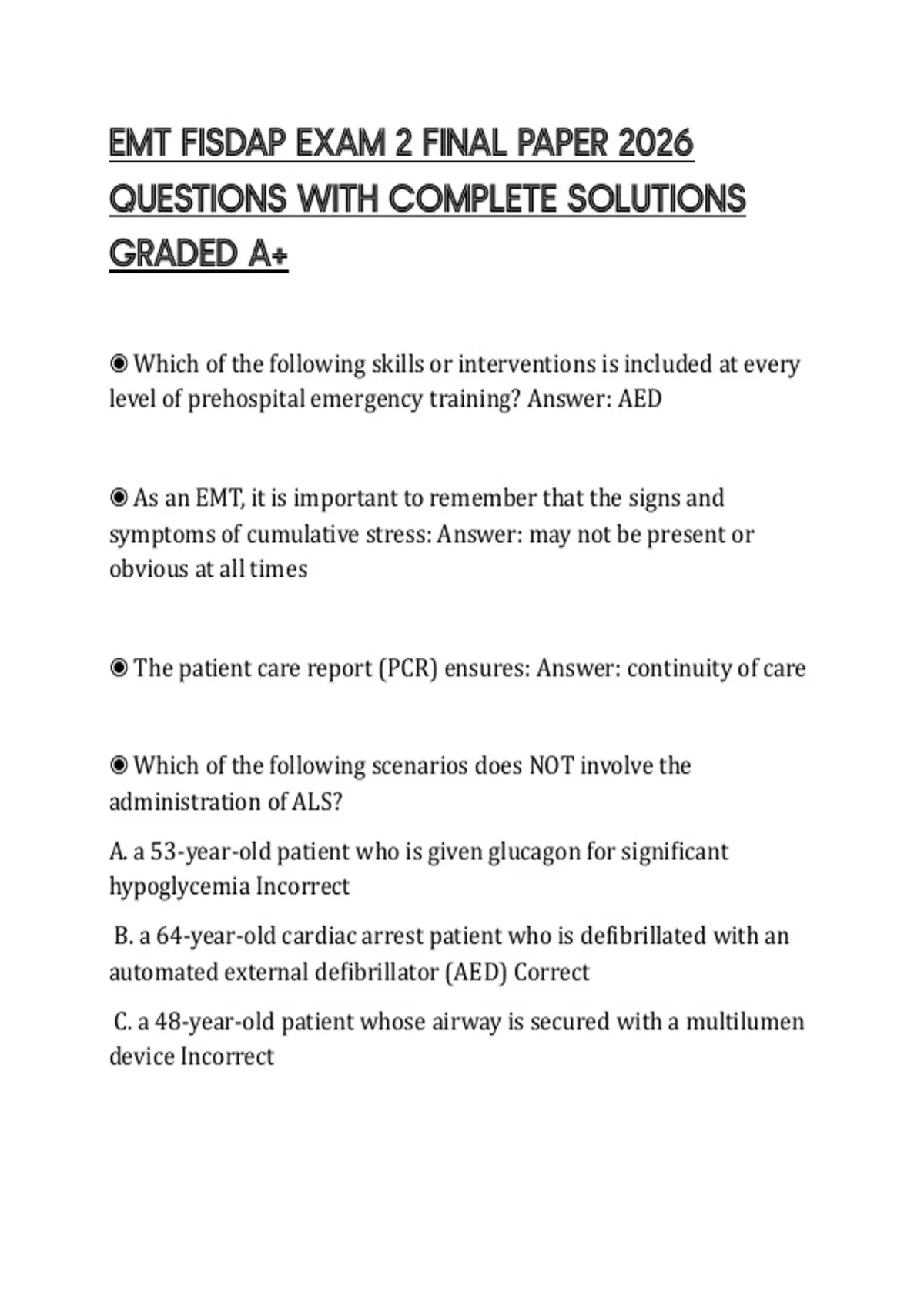 EMT FISDAP EXAM 2 FINAL PAPER 2026 QUESTIONS WITH COMPLETE SOLUTIONS GRADED A+