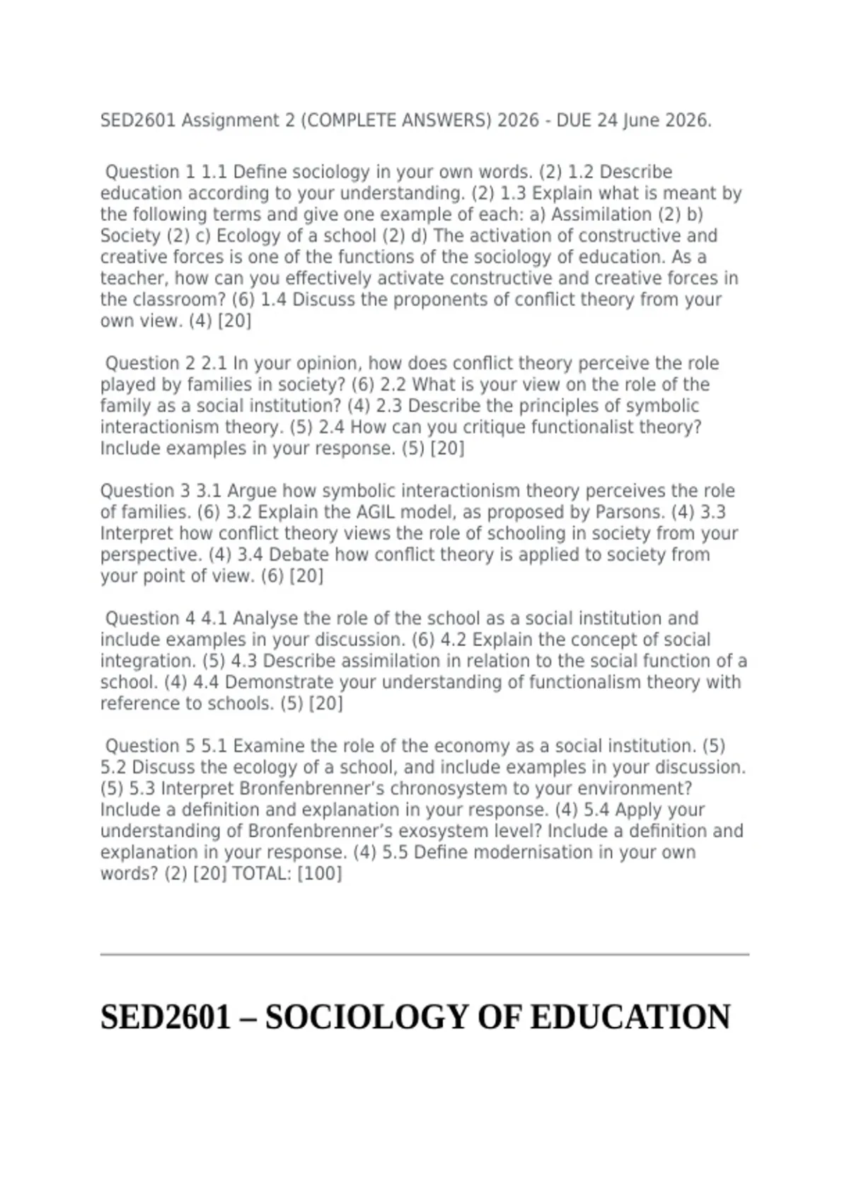 SED2601 Assignment 2 – Sociology of Education: Complete Answers with Explanations