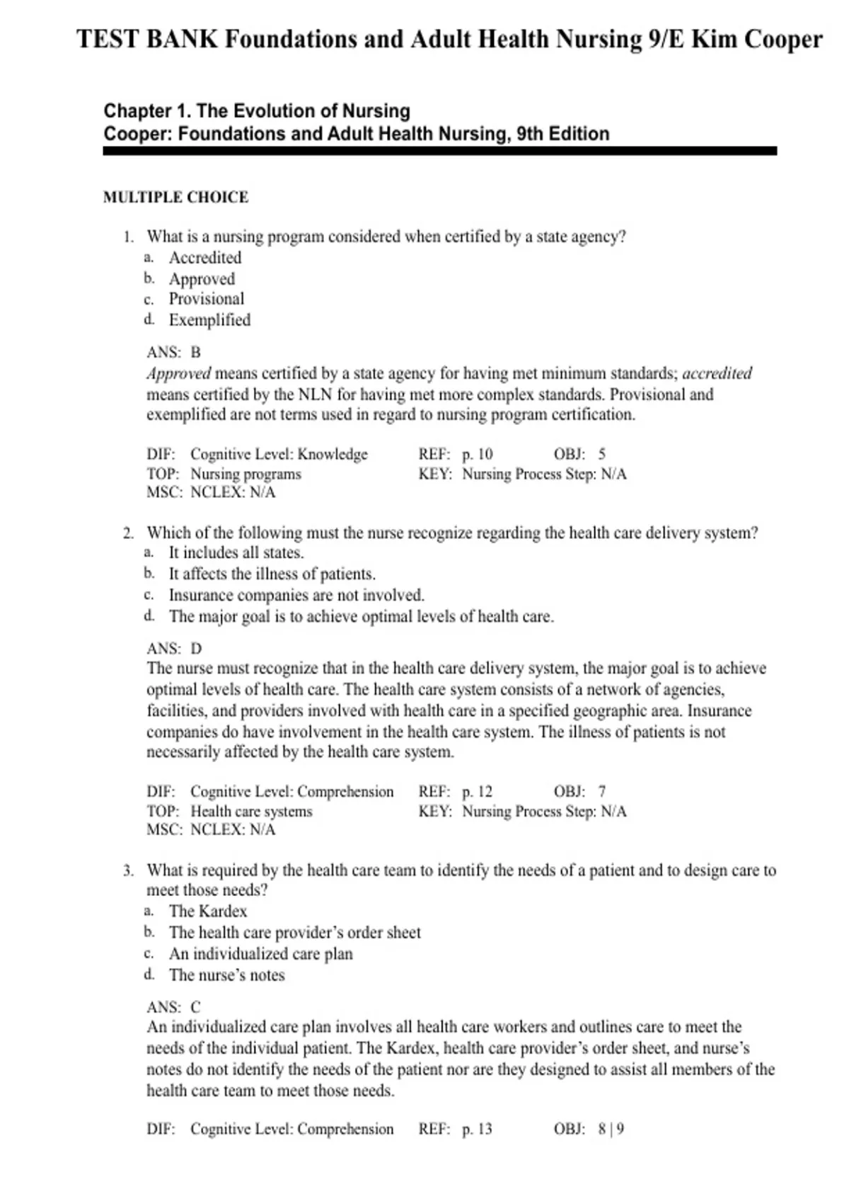 TEST BANK Foundations and Adult Health Nursing 9/E Kim Cooper