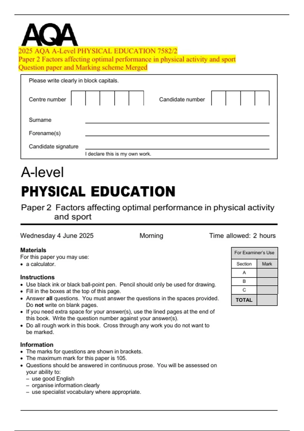 2025 AQA A-Level PHYSICAL EDUCATION 7582/2 Paper 2 Factors affecting optimal performance in physical activity and sport Question paper and Marking scheme Merged