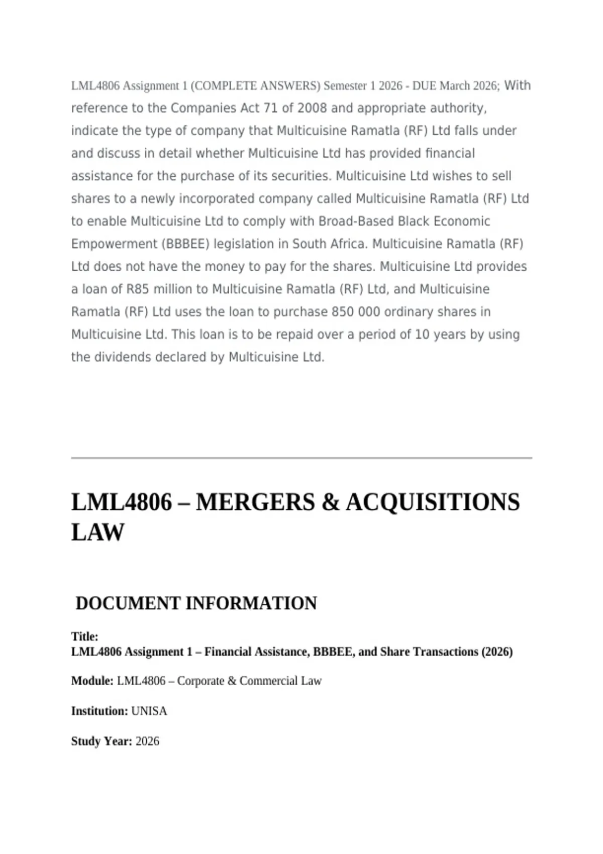 LML4806 Assignment 1 – Financial Assistance, BBBEE, and Share Transactions (2026)