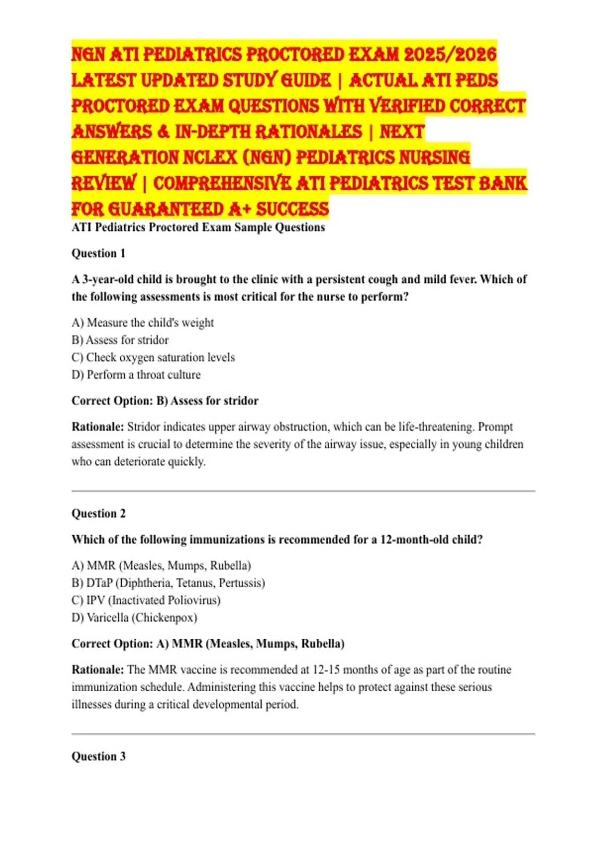 ATI Pediatrics Proctored Exam Sample Questions