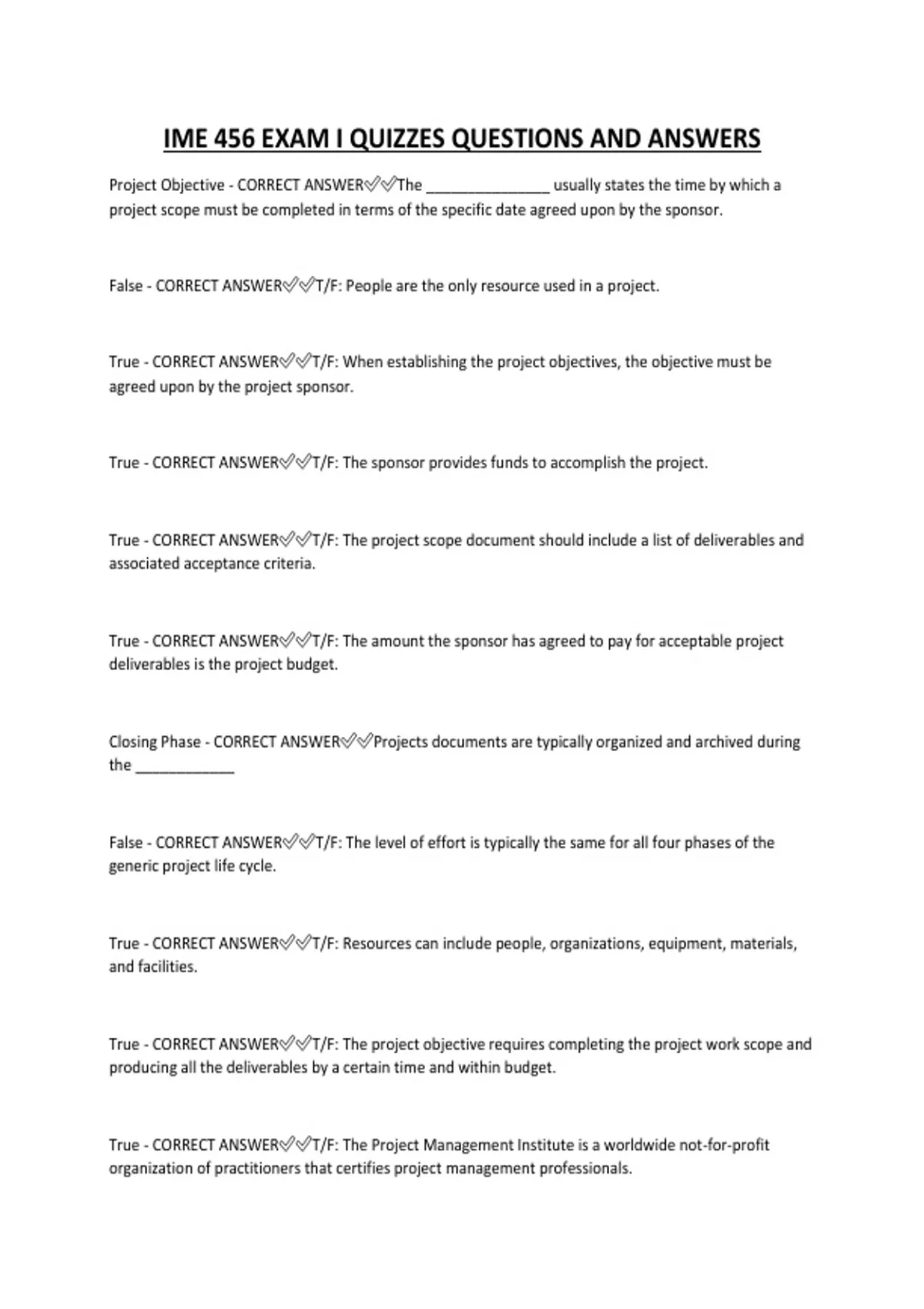 IME 456 EXAM I QUIZZES QUESTIONS AND ANSWERS