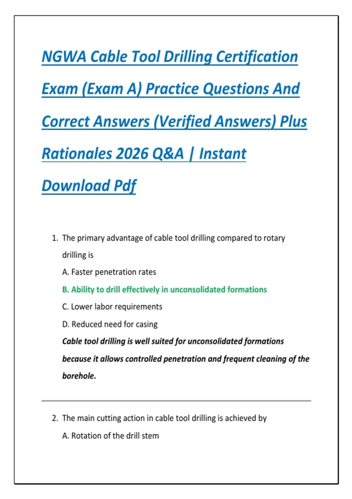 NGWA Cable Tool Drilling Certification Exam (Exam A) Practice Questions And Correct Answers (Verified Answers) Plus Rationales 2026 Q&A | Instant Download Pdf