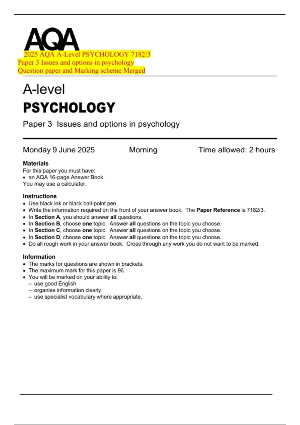 2025 AQA A-Level PSYCHOLOGY 7182/3 Paper 3 Issues and options in psychology Question paper and Marking scheme Merged