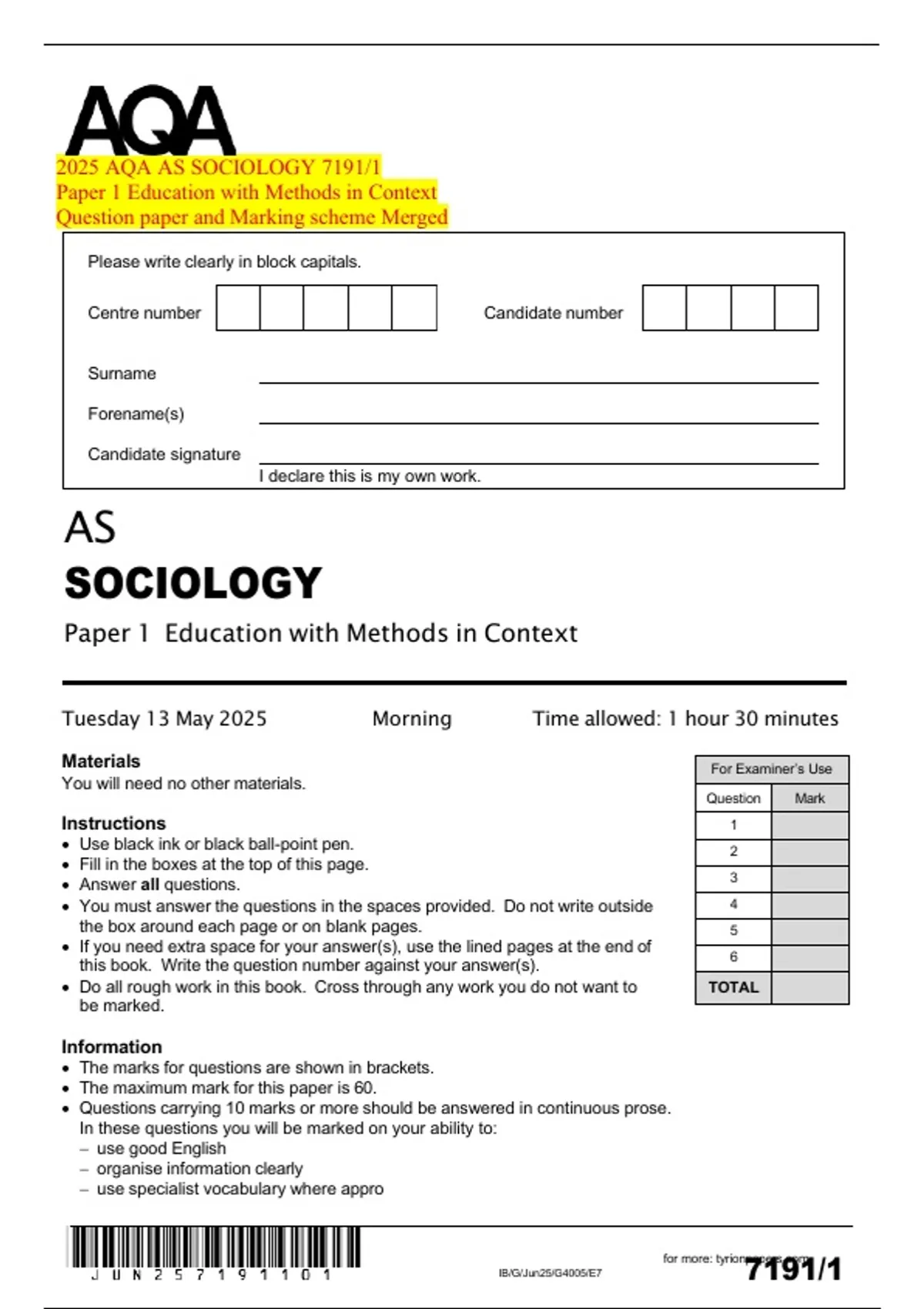 2025 AQA AS SOCIOLOGY 7191/1 Paper 1 Education with Methods in Context Question paper and Marking scheme Merged