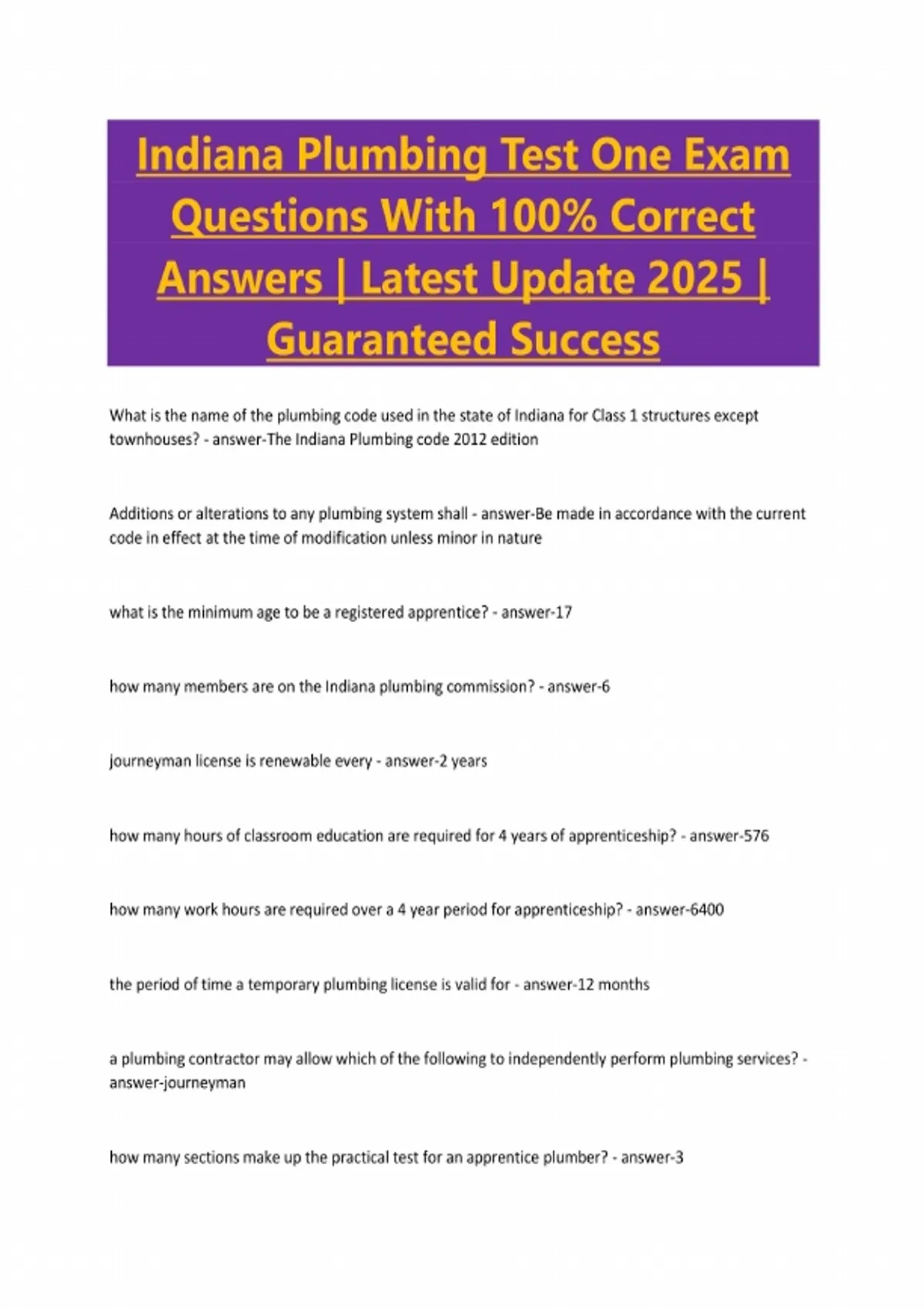Indiana Plumbing Test One Exam Questions With 100% Correct Answers | Latest Update 2025 | Guaranteed Success What is the name of the plumbing code used in the state of Indiana for Class 1 structures except townhouses? - answer-The Indiana Plumbing code 2012 edition Additions or alterations to any plumbing system shall - answer-Be made in accordance with the current code in effect at the time of modification unless minor in nature what is the minimum age to be a registered apprentice? - answer-17 how many members are on the Indiana plumbing commission? - answer-6 journeyman license is renewable every - answer-2 years how many hours of classroom education are required for 4 years of apprenticeship? - answer-576 how many work hours are required over a 4 year period for apprenticeship? - answer-6400 the period of time a temporary plumbing license is valid for - answer-12 months a plumbing contractor may allow which of the following to independently perform plumbing services? - answer-journeyman how many sections make up the practical test for an apprentice plumber? - answer-3