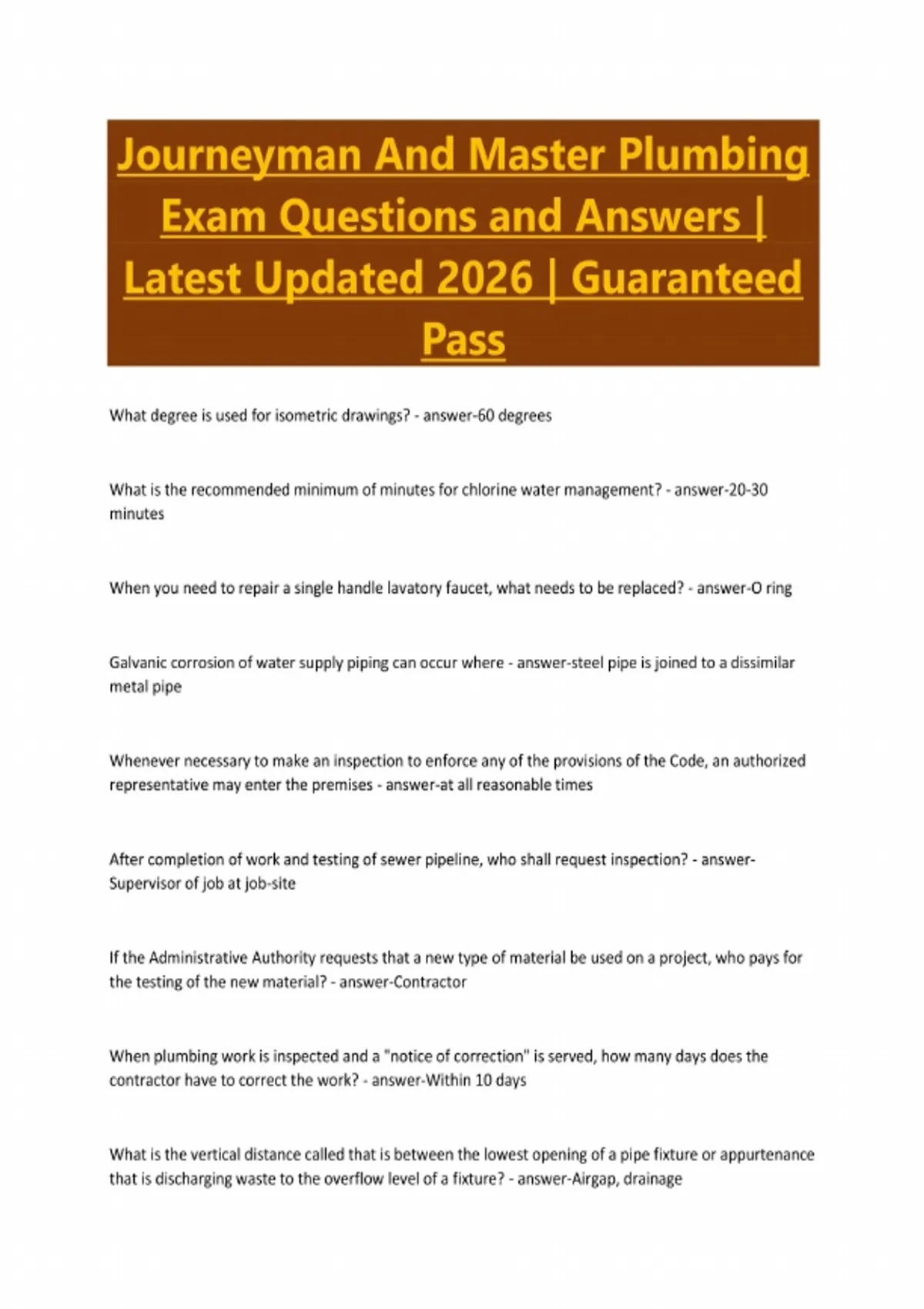 Journeyman And Master Plumbing Exam Questions and Answers | Latest Updated 2026 | Guaranteed Pass What degree is used for isometric drawings? - answer-60 degrees What is the recommended minimum of minutes for chlorine water management? - answer-20-30 minutes When you need to repair a single handle lavatory faucet, what needs to be replaced? - answer-O ring Galvanic corrosion of water supply piping can occur where - answer-steel pipe is joined to a dissimilar metal pipe Whenever necessary to make an inspection to enforce any of the provisions of the Code, an authorized representative may enter the premises - answer-at all reasonable times After completion of work and testing of sewer pipeline, who shall request inspection? - answerSupervisor of job at job-site If the Administrative Authority requests that a new type of material be used on a project, who pays for the testing of the new material? - answer-Contractor When plumbing work is inspected and a "notice of correction" is served, how many days does the contractor have to correct the work? - answer-Within 10 days What is the vertical distance called that is between the lowest opening of a pipe fixture or appurtenance that is discharging waste to the overflow level of a fixture? - answer-Airgap, drainageA cleanout which has direct access without the necessity of removing any panel or door is defined to be - answer-readily accessible Distribution of water from any other source than intended is - answer-backflow Back-siphonage is defined as - answer-the flowing back of used, contaminated or polluted water from a plumbing fixture or vessel into a water supply pipe due to a negative pressure in such pipe The _________________________ is the pipe which carries potable water from a water meter to a building. - answer-building supply Backflow is defined as - answer-non-potable water or other liquids entering a potable water system Any group of two or more similar adjacent fixtures that discharge into a common horizontal waste branch is defined as a - answer-battery Which of the following connects one or more individual vents to a vent stack? - answer-Branch vent A combination waste and vent system may be installed on a _______________________ piping system. - answer-horizontal The minimum level at which a vacuum breaker may be installed above the flood level rim of the device and service is called - answer-the critical level