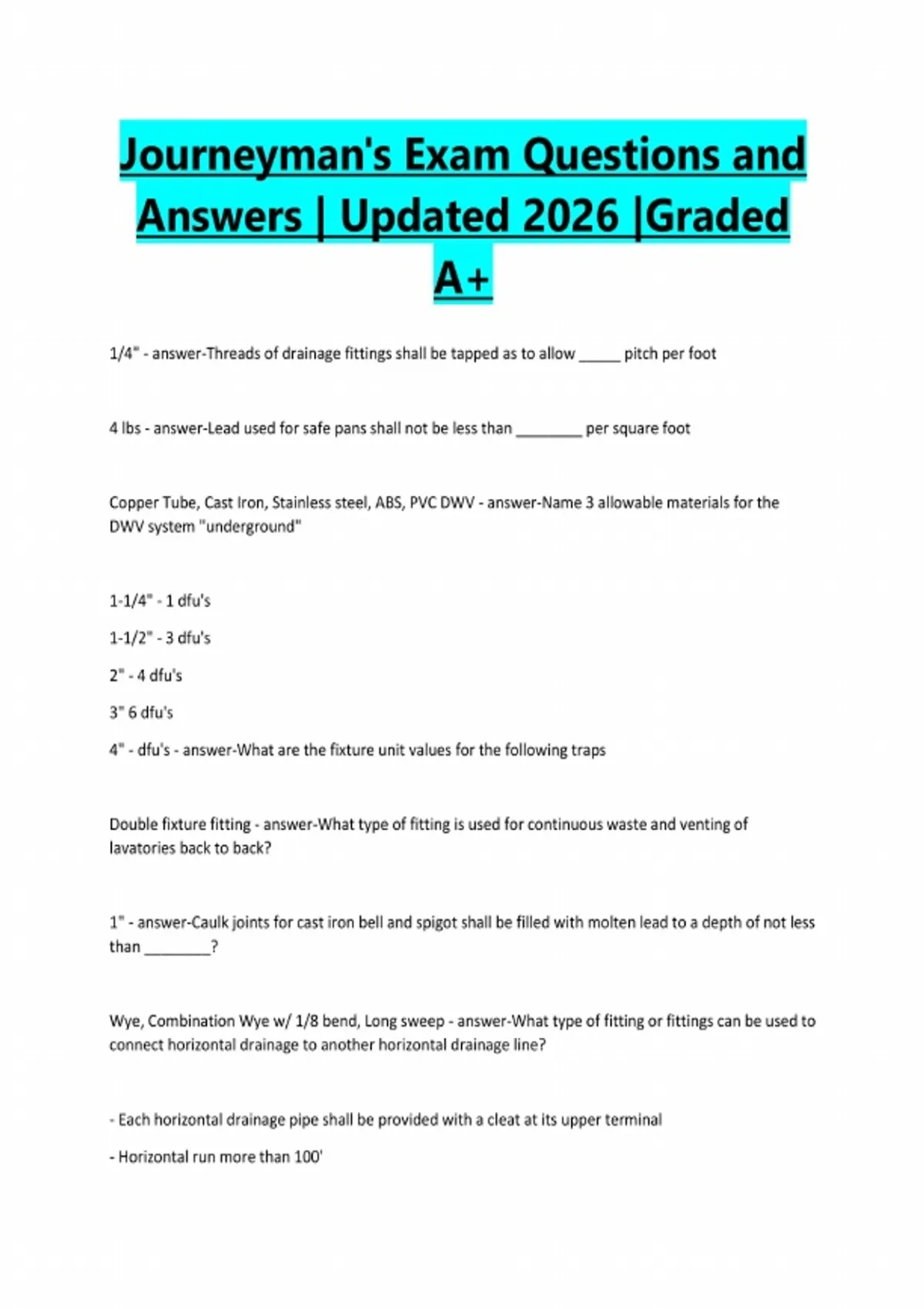 Journeyman's Exam Questions and Answers | Updated 2026 |Graded A+ 1/4" - answer-Threads of drainage fittings shall be tapped as to allow _____ pitch per foot 4 lbs - answer-Lead used for safe pans shall not be less than ________ per square foot Copper Tube, Cast Iron, Stainless steel, ABS, PVC DWV - answer-Name 3 allowable materials for the DWV system "underground" 1-1/4" - 1 dfu's 1-1/2" - 3 dfu's 2" - 4 dfu's 3" 6 dfu's 4" - dfu's - answer-What are the fixture unit values for the following traps Double fixture fitting - answer-What type of fitting is used for continuous waste and venting of lavatories back to back? 1" - answer-Caulk joints for cast iron bell and spigot shall be filled with molten lead to a depth of not less than ________? Wye, Combination Wye w/ 1/8 bend, Long sweep - answer-What type of fitting or fittings can be used to connect horizontal drainage to another horizontal drainage line? - Each horizontal drainage pipe shall be provided with a cleat at its upper terminal - Horizontal run more than 100'- Each horizontal change of direction exceeding 135° - Front Main Cleanout - answer-Cleanout locations required by code 100' - answer-Maximum distance a cleanup can be spaced apart 12" 18" - answer-Minimum clearance in front of a cleanup for 2" or less Minimum clearance in front of a cleanup for 2" or more 20' - answer-Underfloor cleanup shall not be located more than _____ from an access door, trap door, or crawl hole Back Water Valve - answer-When plumbing fixtures are installed on a floor level lower than the next upstream manhole cover of the sewer, such drainage piping shall be protected from backflow of sewage by a ____________ 20 - answer-Sewage ejectors receiving the discharge of water closets or ruinals shall have a discharge capacity not less than ___ gallons per minute 2" - answer-What is the minimum size discharge pipe for an ejector installed in a single dwelling? 2" - answer-The lowest inlet connected to the ejector pump shall have a clearance of not less than ____ from the high water or starting level of the sump. Yes, with prior approval of the AHJ - answer-Can macerating toilet systems be installed instead of a sewage pump system 3/4" - answer-What is the minimum size discharge pipe for a macerating toilet system 1/4" per foot - answer-What is the minimum pitch required fora 2" horizontal drain?