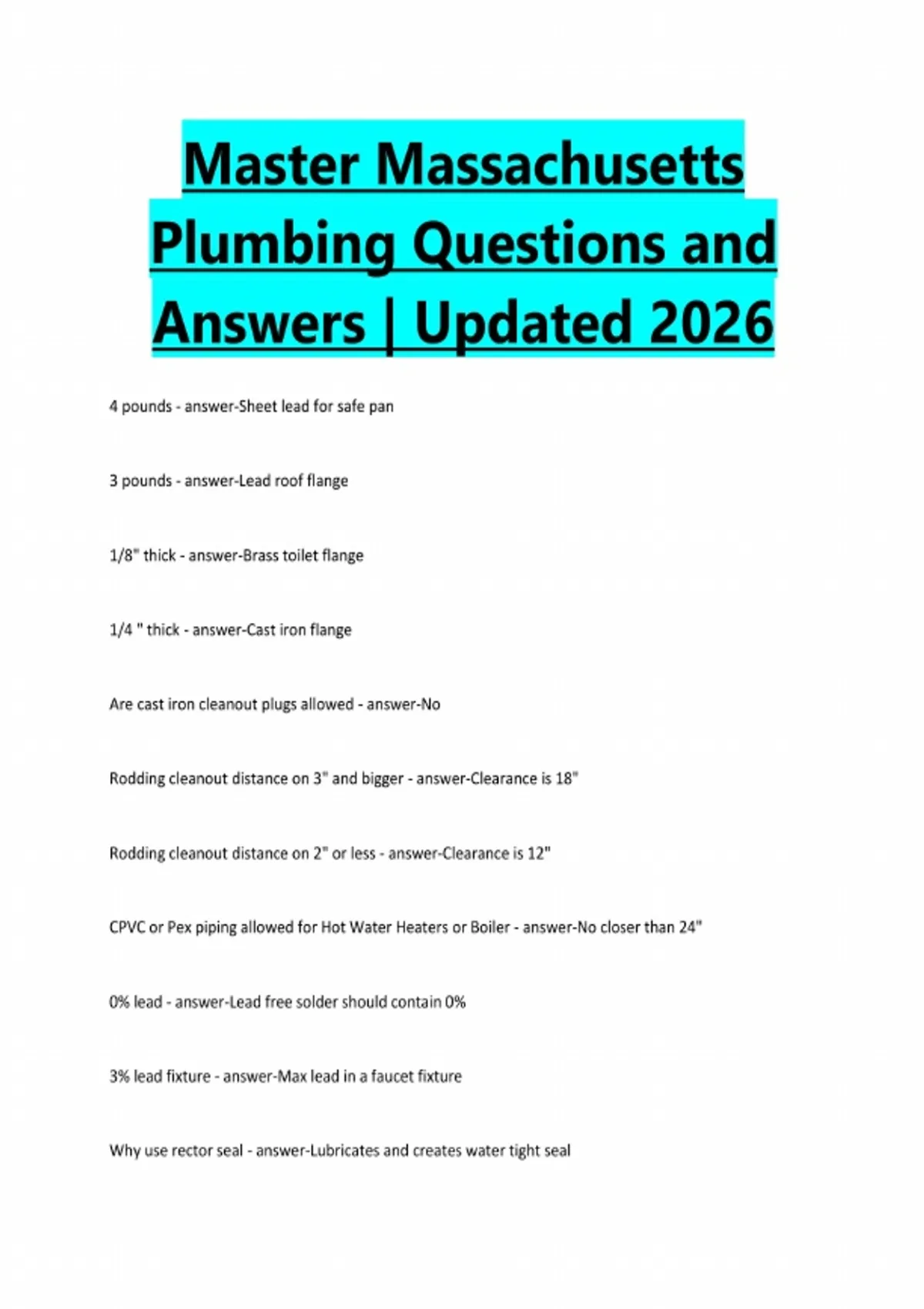 Master Massachusetts Plumbing Questions and Answers | Updated 2026 4 pounds - answer-Sheet lead for safe pan 3 pounds - answer-Lead roof flange 1/8" thick - answer-Brass toilet flange 1/4 " thick - answer-Cast iron flange Are cast iron cleanout plugs allowed - answer-No Rodding cleanout distance on 3" and bigger - answer-Clearance is 18" Rodding cleanout distance on 2" or less - answer-Clearance is 12" CPVC or Pex piping allowed for Hot Water Heaters or Boiler - answer-No closer than 24" 0% lead - answer-Lead free solder should contain 0% 3% lead fixture - answer-Max lead in a faucet fixture Why use rector seal - answer-Lubricates and creates water tight sealTransition from abs - answer-PVC to ABS connections to be made via male to female adapter 24" - answer-Fixture outlet to trap weir not to exceed 24" Combination Fixtures - answer-Max 30" apart and no more than 6in deeper than another Prohibited traps - answer-Bell, crown vented, full "s" traps- *Drum Traps are allowed! Min trap seal - answer-Min trap seal is 2-4 " Deadend Pipe - answer-2' or greater 10" underground pipe or larger - answer-Manhole @ change of size, alignment, grade or elevation Grease trap - answer-2 pounds per gpm Commercial Laundry - answer-Commercial Laundry drain must handle 75% of total washing machines