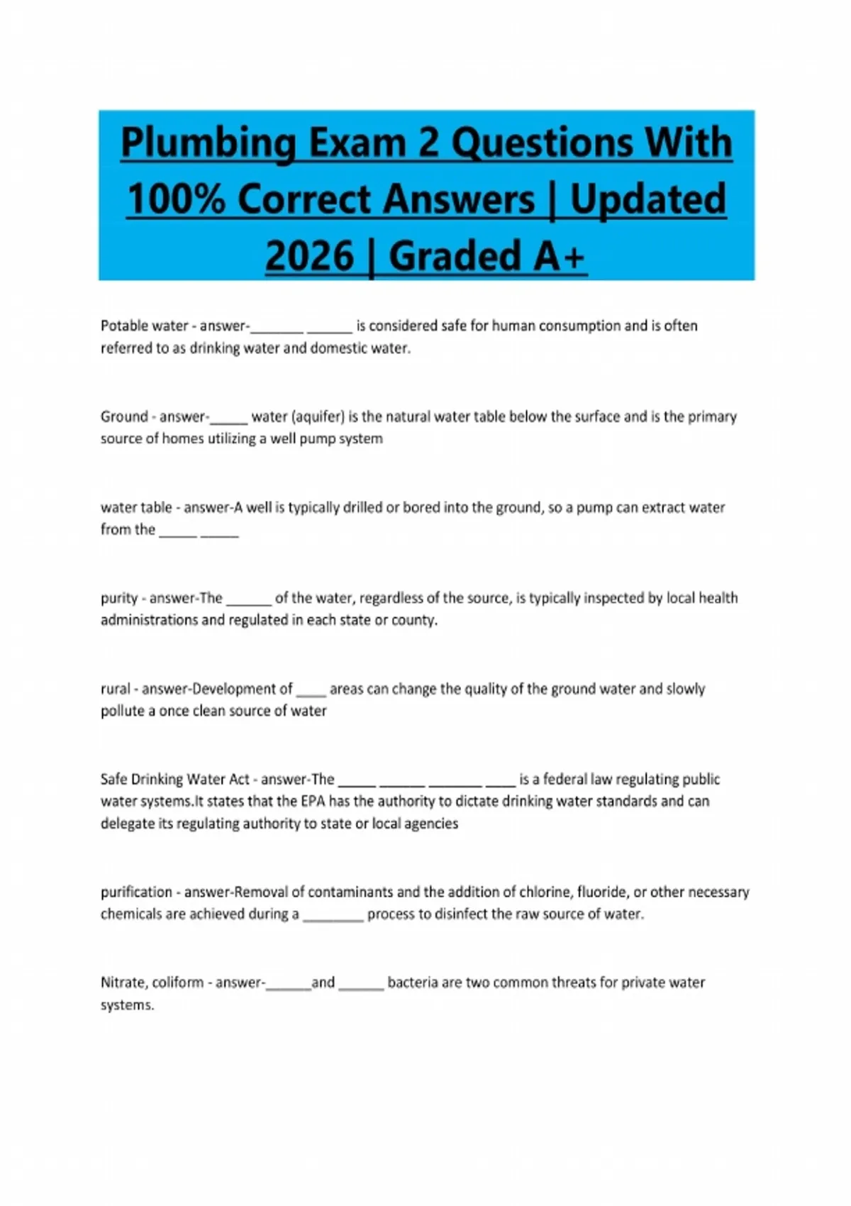 Plumbing Exam 2 Questions With 100% Correct Answers | Updated 2026 | Graded A+ Potable water - answer-_______ ______ is considered safe for human consumption and is often referred to as drinking water and domestic water. Ground - answer-_____ water (aquifer) is the natural water table below the surface and is the primary source of homes utilizing a well pump system water table - answer-A well is typically drilled or bored into the ground, so a pump can extract water from the _____ _____ purity - answer-The ______ of the water, regardless of the source, is typically inspected by local health administrations and regulated in each state or county. rural - answer-Development of ____ areas can change the quality of the ground water and slowly pollute a once clean source of water Safe Drinking Water Act - answer-The _____ ______ _______ ____ is a federal law regulating public water systems.It states that the EPA has the authority to dictate drinking water standards and can delegate its regulating authority to state or local agencies purification - answer-Removal of contaminants and the addition of chlorine, fluoride, or other necessary chemicals are achieved during a ________ process to disinfect the raw source of water. Nitrate, coliform - answer-______and ______ bacteria are two common threats for private water service system - answer-A _____ _____ ______ is the piping from a water meter or well to the building. Polyethylene, PVC - answer-_______ and _____ are two products allowable by code for a water service system, but they are not allowed to be installed in the building for water distribution systems. 60 - answer-Typically, the pressure switch on a well system is set to start the pump at 30 psi and turn off at __ psi. 80 - answer-Code dictates that a municipal or community water system must have a pressure-reducing valve if the incoming pressure exceeds __ psi. backflow - answer-If a water service is installed in the same trench as a drain or sewer, the possibility of _____ could occur. 5' - answer-Most codes dictate that a water service installed at the same elevation as a sewer must be separated from the sewer by at least ___ of undisturbed or compacted soil. higher - answer-To avoid excavating a separate trench, some codes allow the water service to be installed in the same trench, but it must be _____ than the sewer elevation. 1' - answer-The bottom of the water service must be at least ___ higher than the top of the sewer. perpendicular - answer-A water service that crosses a sewer trench at any angle is considered __________ sleeve - answer-To ensure that the water service pipe is protected against damage from possible excavation to access the sewer, most codes require the pipe crossing a sewer trench be installed in an oversized piece of pipe known as a _____.