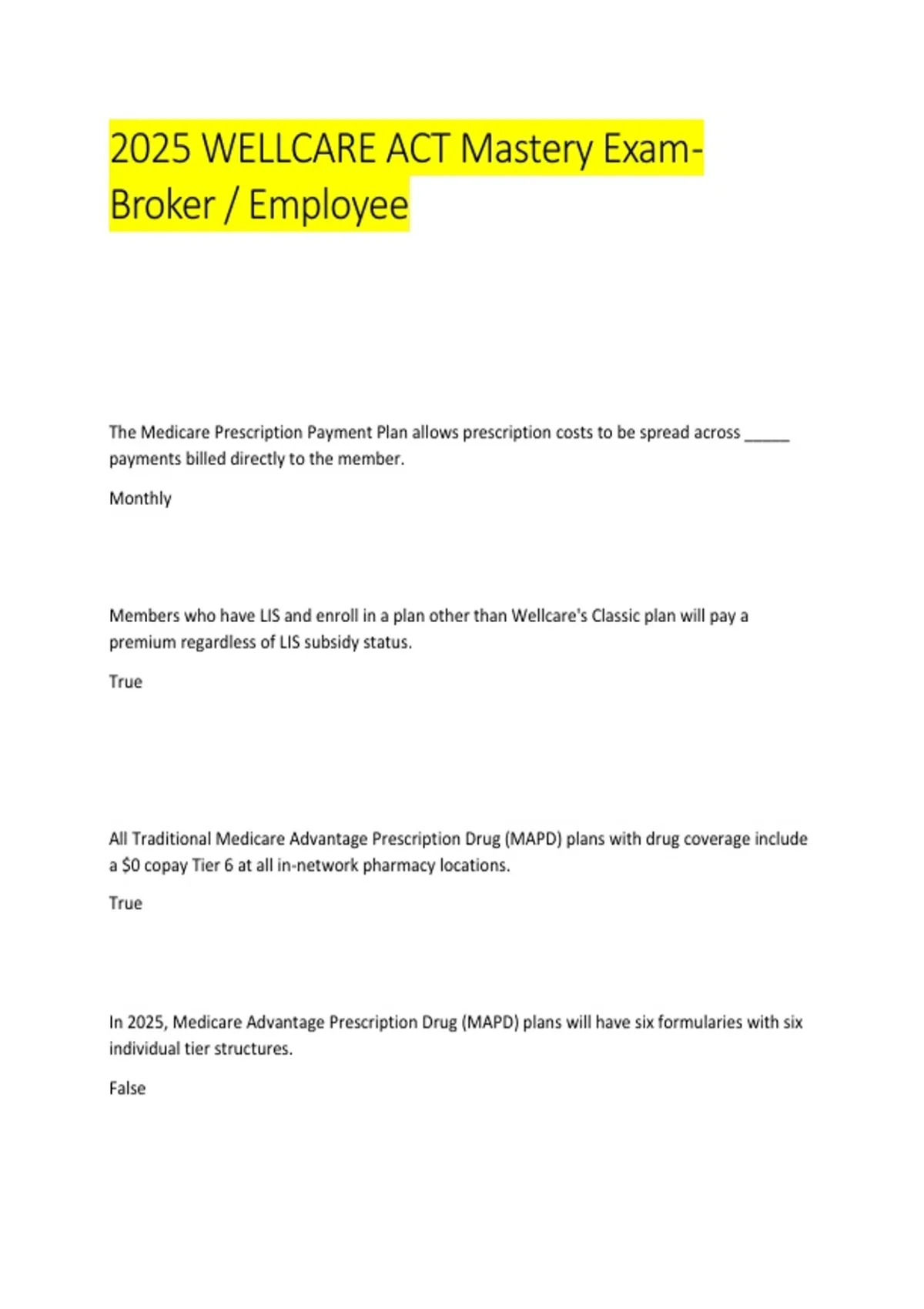This 2026 updated WELLCARE ACT Mastery Exam for Broker Employees (2025) provides comprehensive questions and answers covering healthcare policies, broker responsibilities, compliance, and program administration. Designed for broker employees preparing for WELLCARE certification, this resource supports exam preparation, reinforces essential knowledge, and enhances confidence for achieving mastery on the WELLCARE ACT exam.