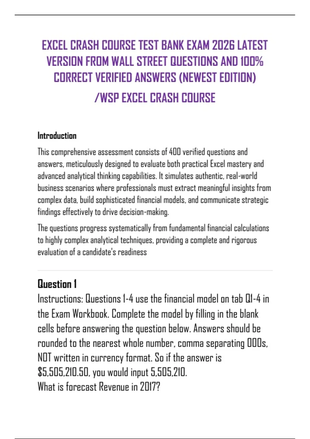 Access the Excel Crash Course Test Bank Exam – 2026 Latest Version from Wall Street Prep (WSP), featuring updated exam-style questions with 100% correct and verified answers. This newest edition is designed for candidates preparing for the WSP Excel Crash Course assessment, including retake exams and final evaluations. This comprehensive test bank covers realistic Wall Street Prep Excel questions, detailed answer explanations, and step-by-step solution logic aligned with the latest 2026 exam structure. Topics include essential and advanced Excel formulas, functions, shortcuts, financial modeling techniques, data analysis methods, and problem-solving scenarios commonly tested in the WSP Excel Crash Course. Ideal for finance students, investment banking candidates, analysts, and professionals, this resource functions as a study guide, revision tool, and exam practice reference. Each question is structured to reflect actual exam difficulty and format, helping learners verify their understanding, identify weak areas, and approach the exam with confidence. Whether you are preparing for a first attempt or a retake, this Excel Crash Course Test Bank (Newest Edition) provides a reliable, up-to-date, and exam-focused preparation solution for mastering Excel skills required in real-world financial roles.