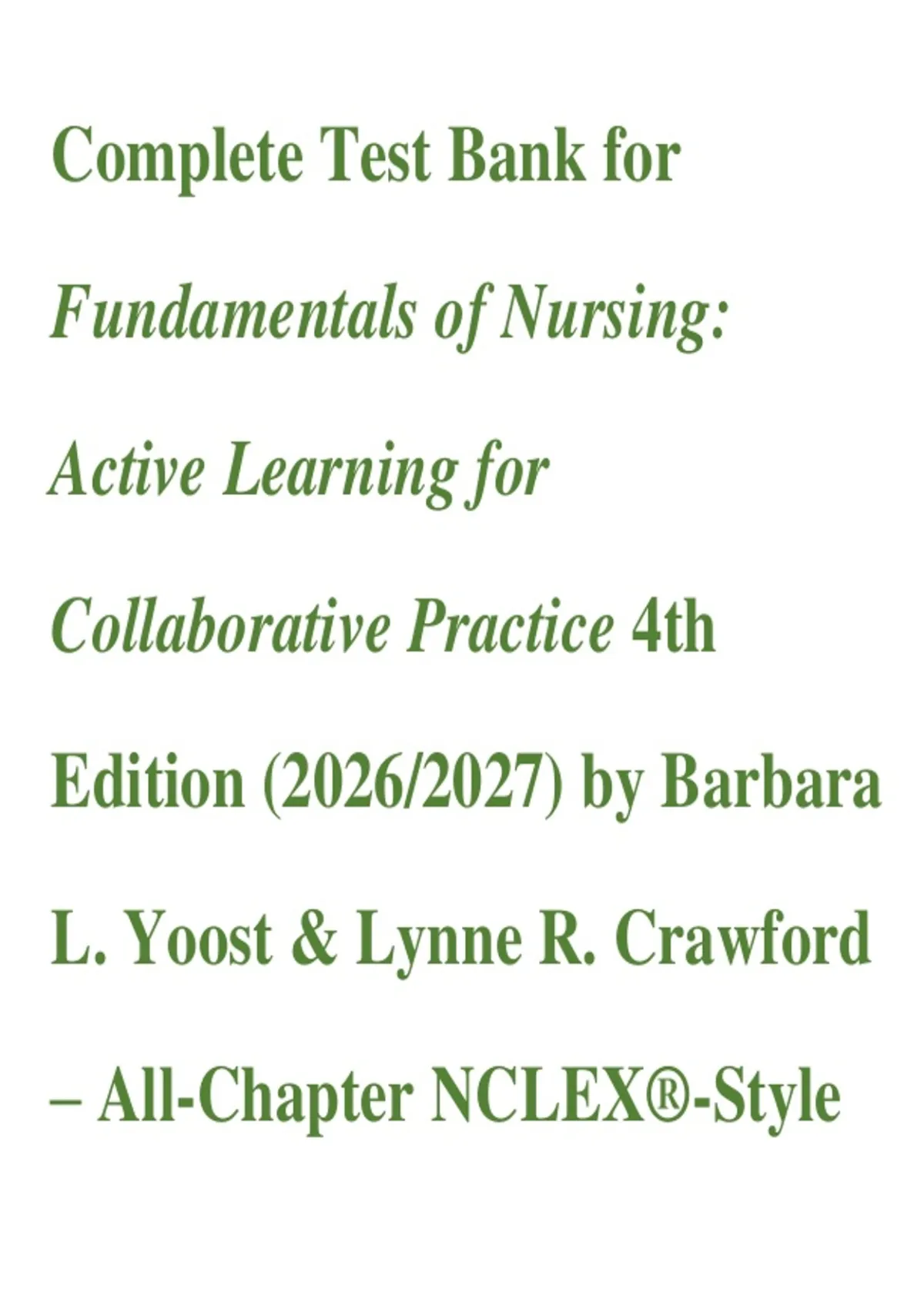 The Complete Test Bank for Fundamentals of Nursing: Active Learning for Collaborative Practice, 4th Edition (2026/2027) by Barbara L. Yoost & Lynne R. Crawford provides a comprehensive collection of chapter-by-chapter exam questions with verified answers and detailed rationales aligned with the latest 4th Edition of this core nursing fundamentals text. Covering key foundational concepts — including patient-centered care, safety and quality, therapeutic communication, health assessment, infection control, clinical skills, documentation, clinical reasoning, and collaborative practice — this resource reinforces critical thinking and supports mastery of essential nursing competencies. Designed for undergraduate nursing students and educators, it prepares learners for classroom exams, clinical evaluations, and NCLEX®-style review with evidence-based practice emphasis.