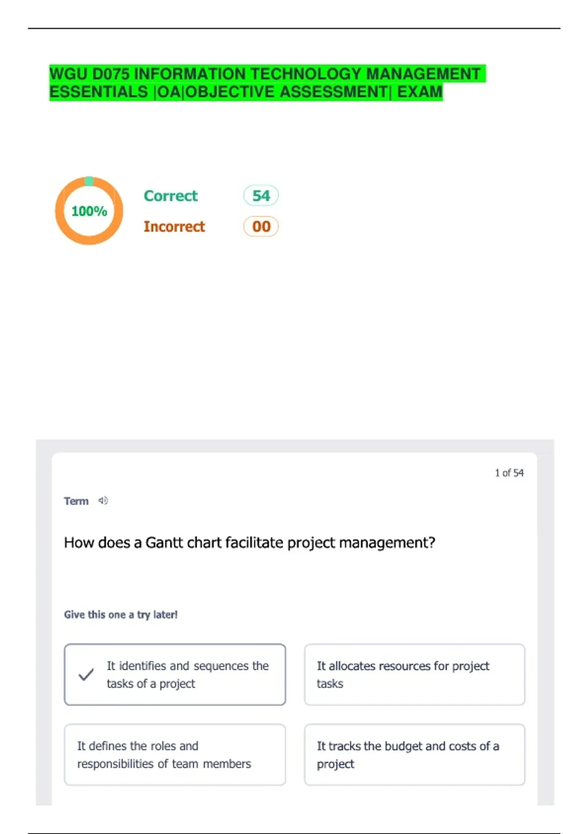WGU D075 INFORMATION TECHNOLOGY MANAGEMENT ESSENTIALS |OA| OBJECTIVE ASSESSMENT | EXAM QUESTIONS AND ANSWERS | FULLY SOLVED