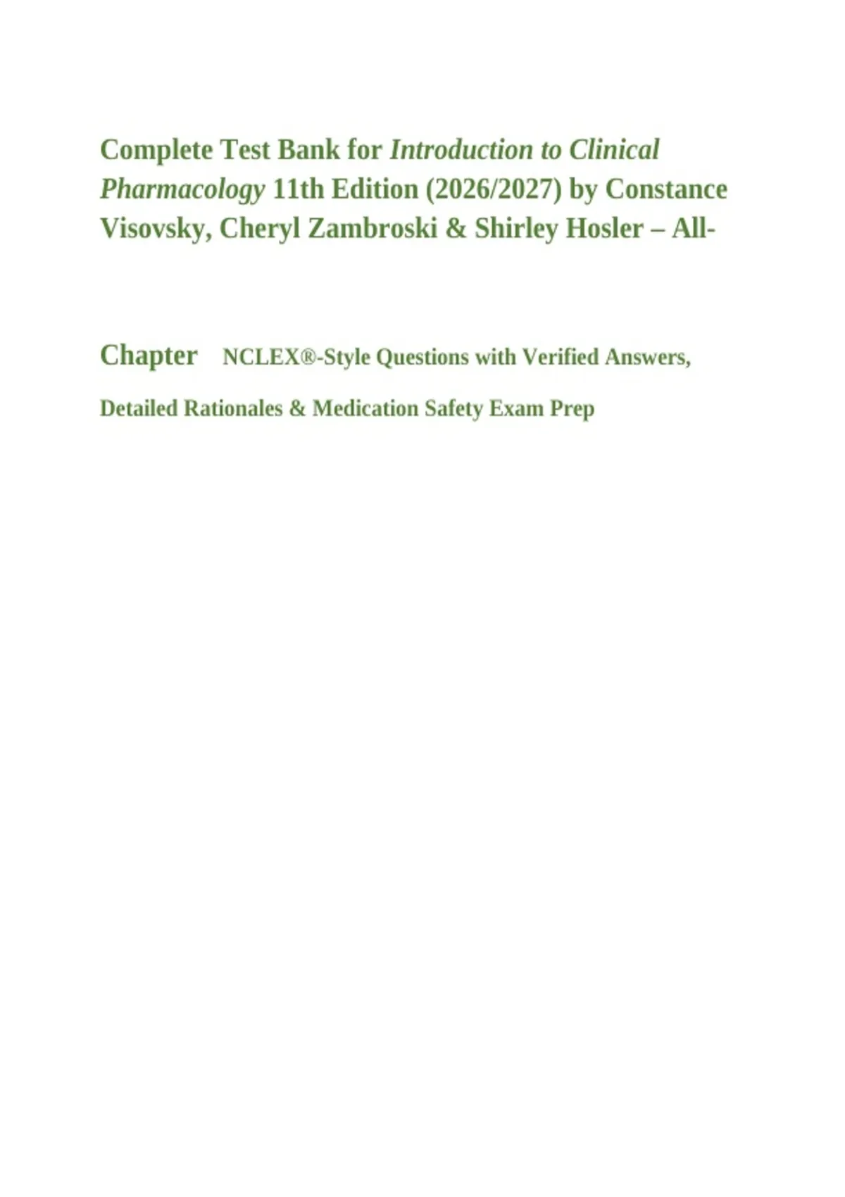 The Complete Test Bank for Introduction to Clinical Pharmacology, 11th Edition (2026/2027) by Constance Visovsky, Cheryl Zambroski, and Shirley Hosler provides a comprehensive chapter-by-chapter collection of exam questions with verified answers and detailed rationales, fully aligned with the latest 11th Edition. Covering pharmacokinetics, pharmacodynamics, major drug classifications, medication administration, patient safety, adverse effects, and the nursing process, this resource strengthens critical thinking and clinical decision-making. Designed for nursing students and educators, it supports classroom exams, NCLEX®-style review, and safe medication administration practice.