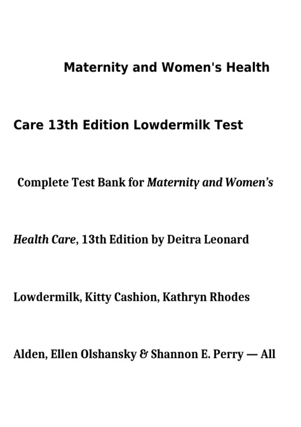 The Complete Test Bank for Maternity and Women’s Health Care, 14th Edition (2026/2027) by Carolyn Lowdermilk, Shannon Perry, Mary C. Bobak, and Deborah D. Alden provides a comprehensive chapter-by-chapter collection of exam questions with verified answers and detailed rationales, fully aligned with the latest 14th Edition of this essential maternal-child nursing textbook. Covering pregnancy, labor and birth, postpartum care, newborn care, women’s reproductive health, high-risk pregnancy, and family-centered care, this resource strengthens clinical reasoning, critical thinking, and patient-centered nursing practice. Designed for nursing students and educators, it prepares learners for classroom exams, NCLEX® review, and clinical practice in obstetrics and gynecology.