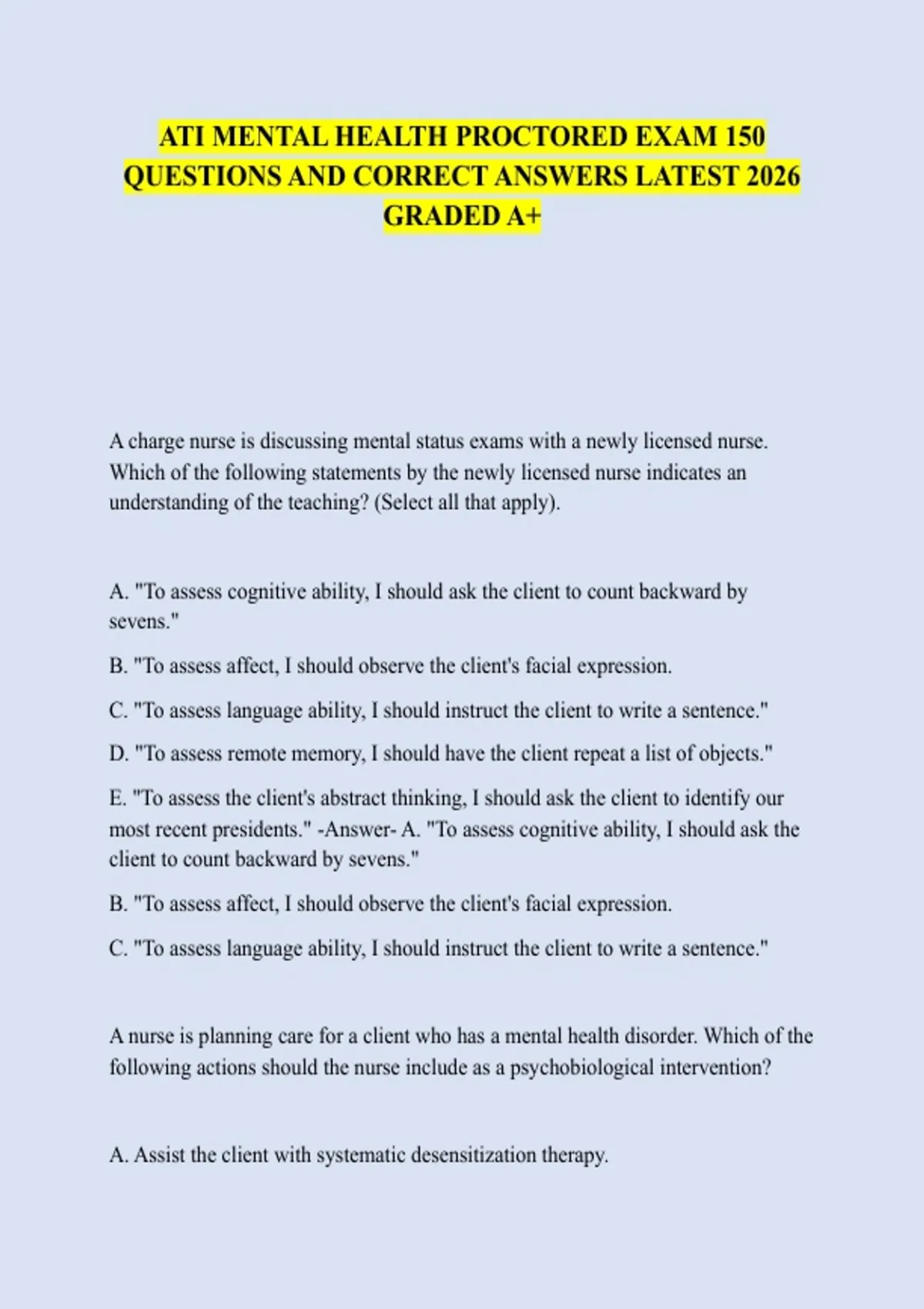 ATI MENTAL HEALTH PROCTORED EXAM 150