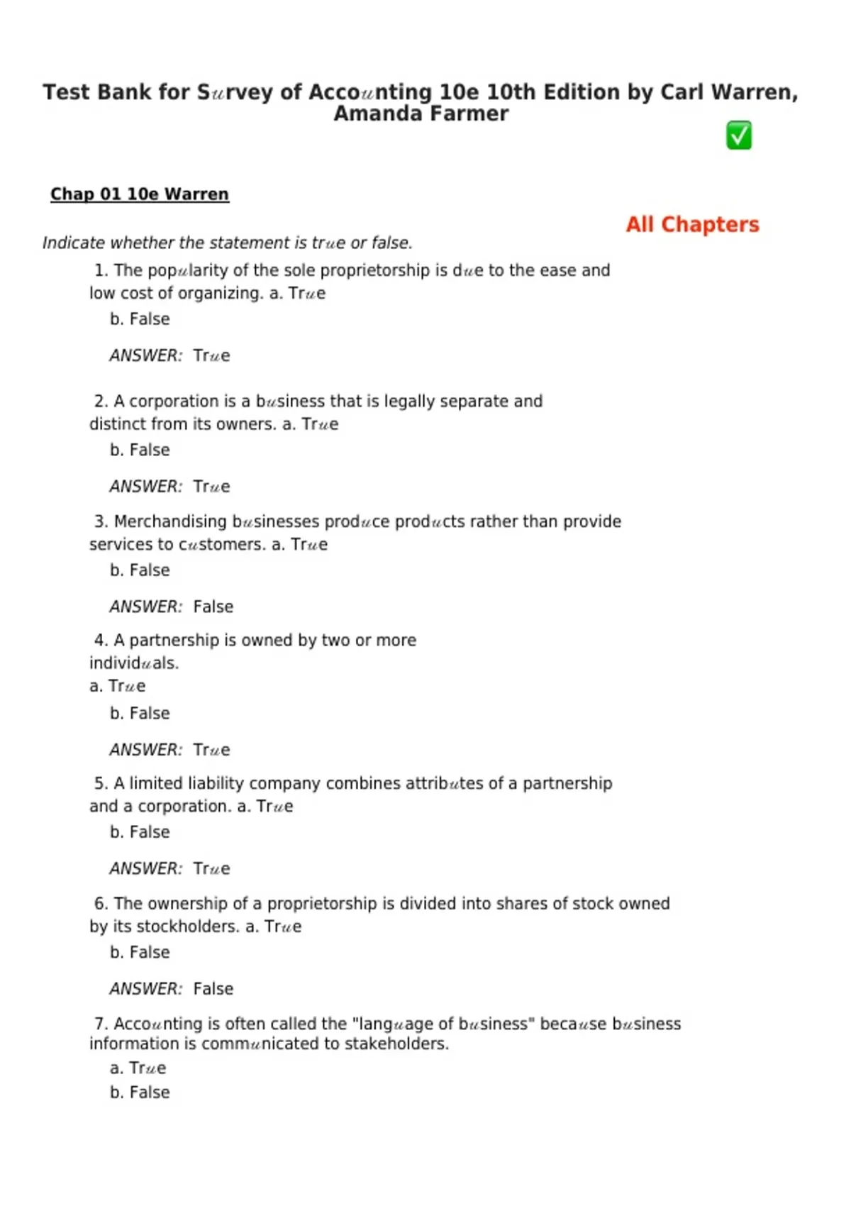 The Complete Test Bank for Survey of Accounting, 11th Edition (2026/2027) by Carl Warren and Amanda Farmer provides a comprehensive chapter-by-chapter collection of exam questions with verified answers and detailed solutions, fully aligned with the latest 11th Edition of this foundational accounting textbook. Covering key topics including financial statements, accounting principles, journal entries, adjusting and closing entries, merchandising operations, internal controls, and financial analysis, this resource strengthens conceptual understanding, problem-solving, and analytical skills. Designed for undergraduate accounting students and educators, it supports classroom exams, homework assignments, and professional certification review.