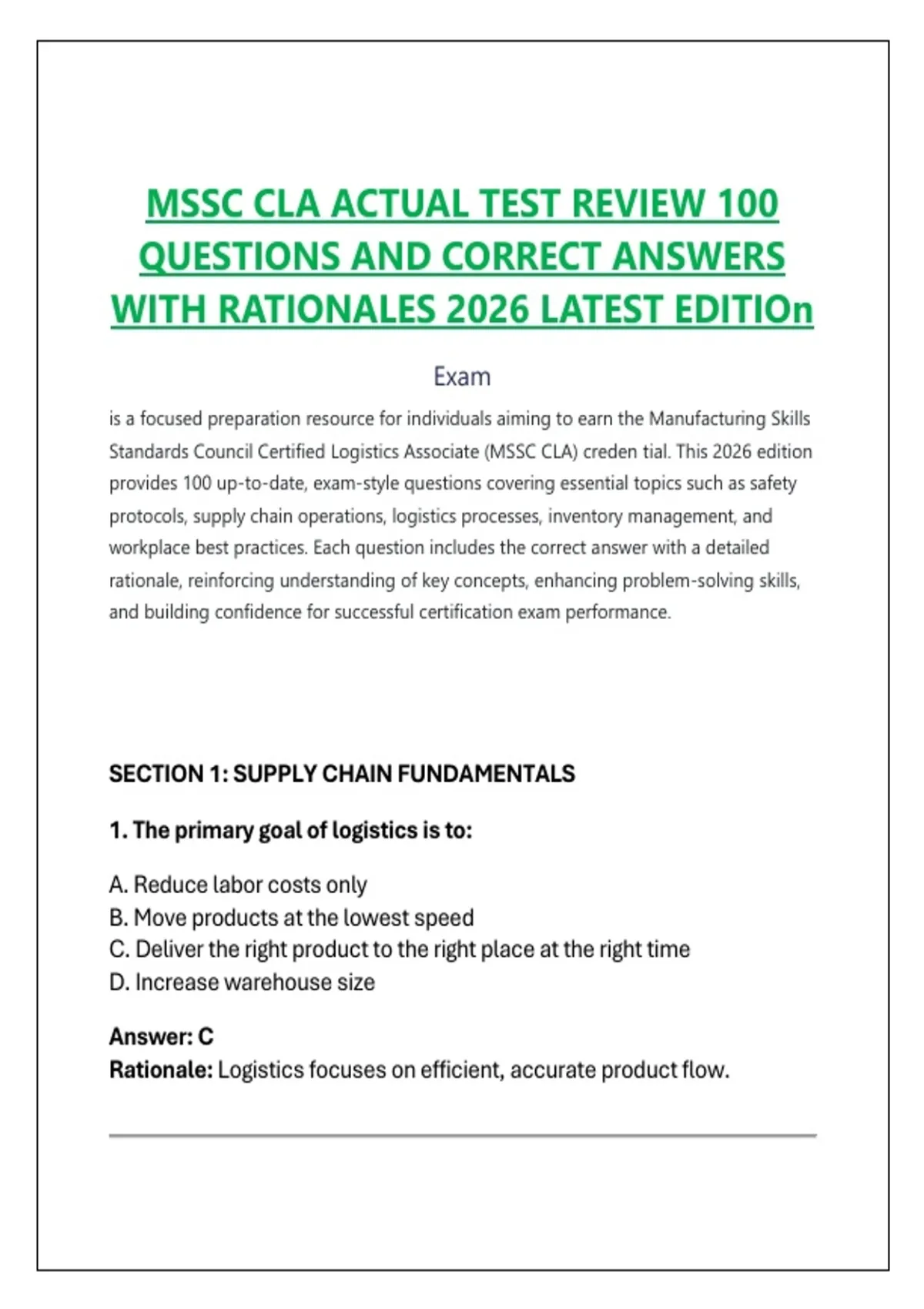MSSC CLA ACTUAL TEST REVIEW 100 QUESTIONS AND CORRECT ANSWERS WITH RATIONALES 2026 LATEST EDITIOn
