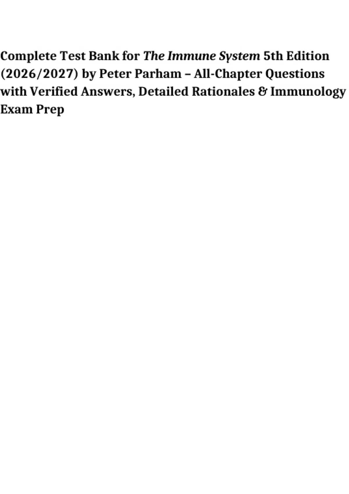 The Complete Test Bank for The Immune System, 5th Edition (2026/2027) by Peter Parham provides a comprehensive chapter-by-chapter collection of exam questions with verified answers and detailed rationales, fully aligned with the latest 5th Edition of this key immunology textbook. Covering all major topics—including innate and adaptive immunity, immune cells and organs, antigen recognition, immunological disorders, vaccines, and immune system regulation—this resource strengthens conceptual understanding, critical thinking, and practical application in medicine, nursing, and biomedical sciences. Designed for undergraduate, graduate, and medical students, it supports classroom exams, laboratory assessments, and professional immunology review.