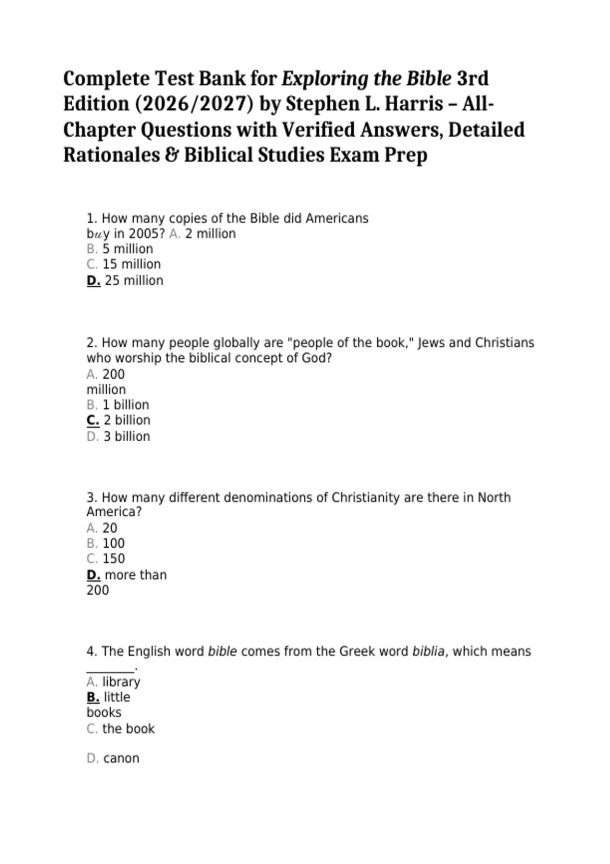 The Complete Test Bank for Exploring the Bible, 3rd Edition (2026/2027) by Stephen L. Harris provides a comprehensive chapter-by-chapter collection of exam questions with verified answers and detailed rationales, fully aligned with the latest 3rd Edition of this widely used biblical studies textbook. Covering all major topics—including Old and New Testament history, literary analysis, theological themes, interpretation methods, and historical context—this resource strengthens comprehension, critical thinking, and analytical skills in biblical scholarship. Designed for college, seminary, and religious studies students, it supports classroom exams, study review sessions, and academic research preparation.
