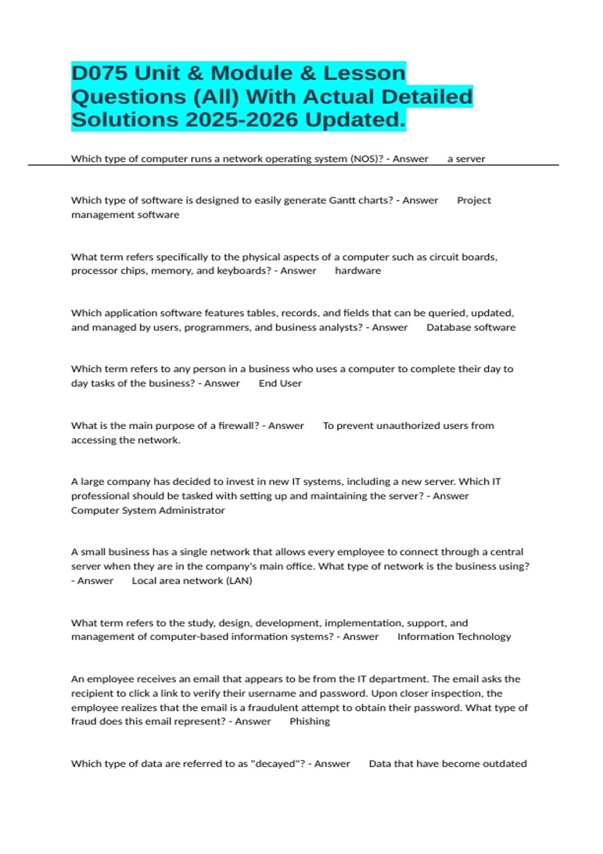 D075 Unit & Module & Lesson Questions (All) With Actual Detailed Solutions Updated.