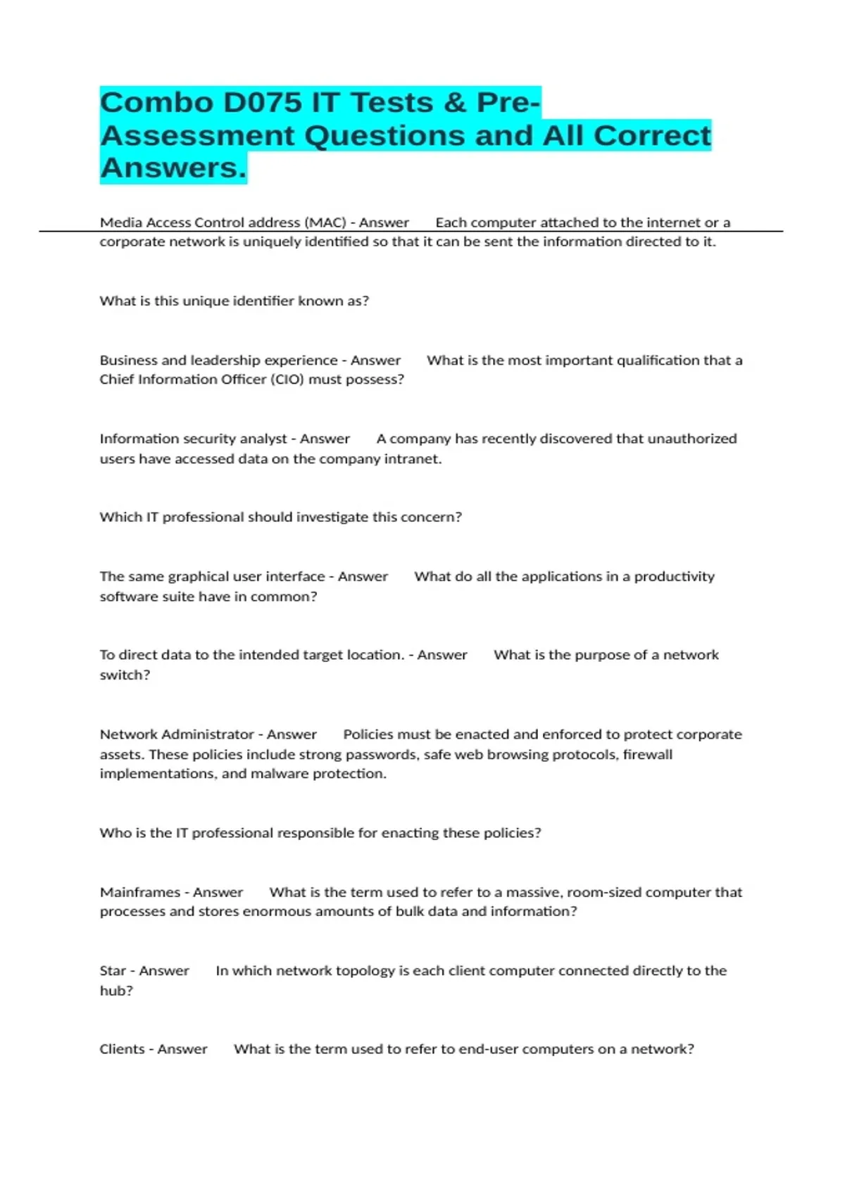 Combo D075 IT Tests & Pre-Assessment Questions and All Correct Answers.
